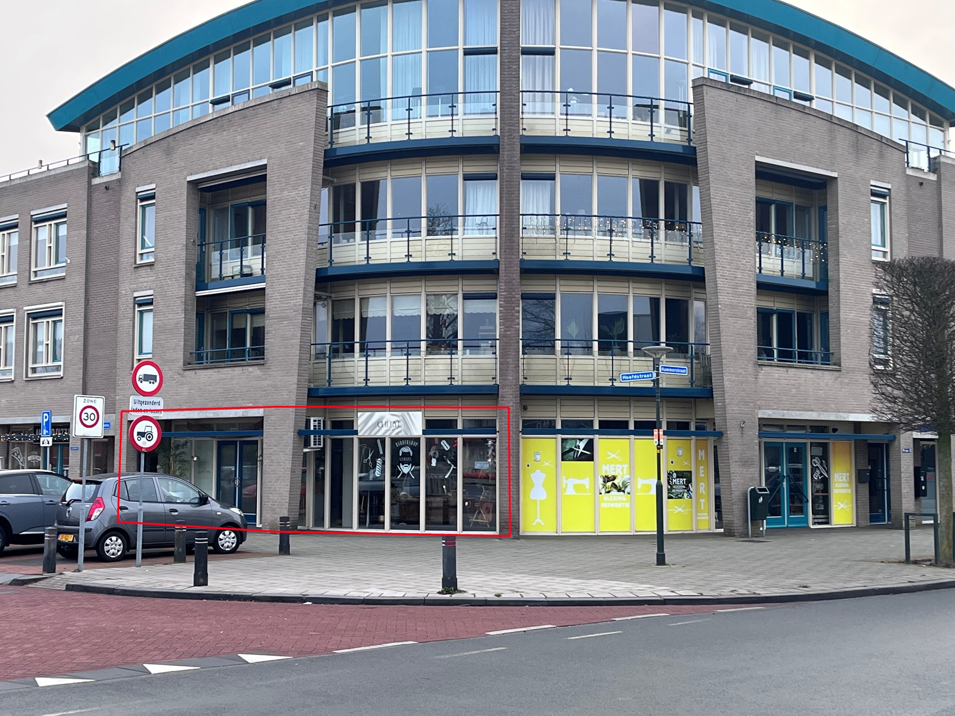De ruimte is prominent gesitueerd op de hoek van de Hoofdstraat en de Hammerstraat, direct aan het kanaal, wat zorgt voor een uitstekende zichtbaarheid. De bereikbaarheid is goed, met parkeergelegenheid direct voor de deur.