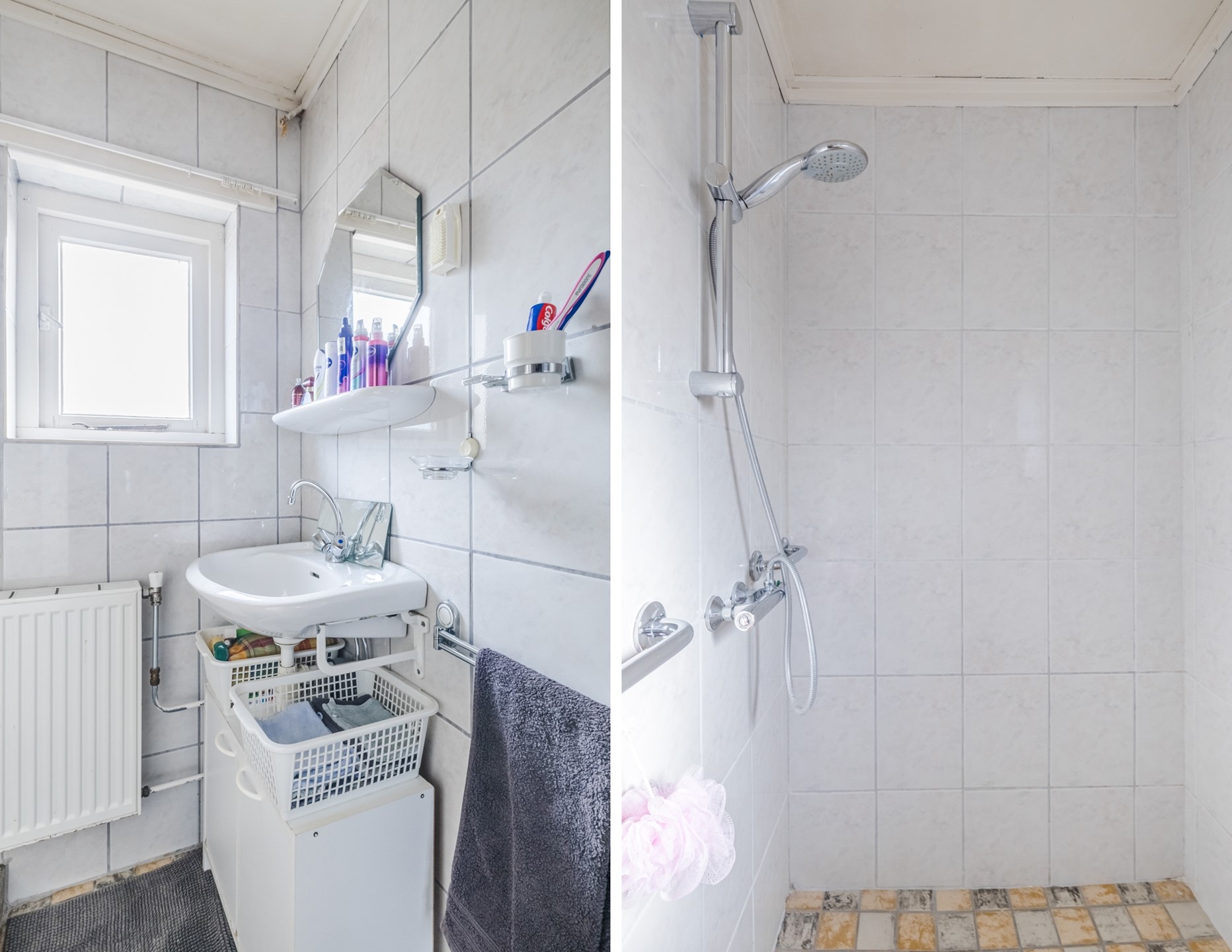 Overloop, eenvoudige badkamer met wastafel en ruime douche-inrichting, 3 slaapkamers waarvan 2 voorzien van vaste kasten en 1 slaapkamer voorzien van een vaste ingebouwde trap welke toegang biedt tot de 2e verdieping.