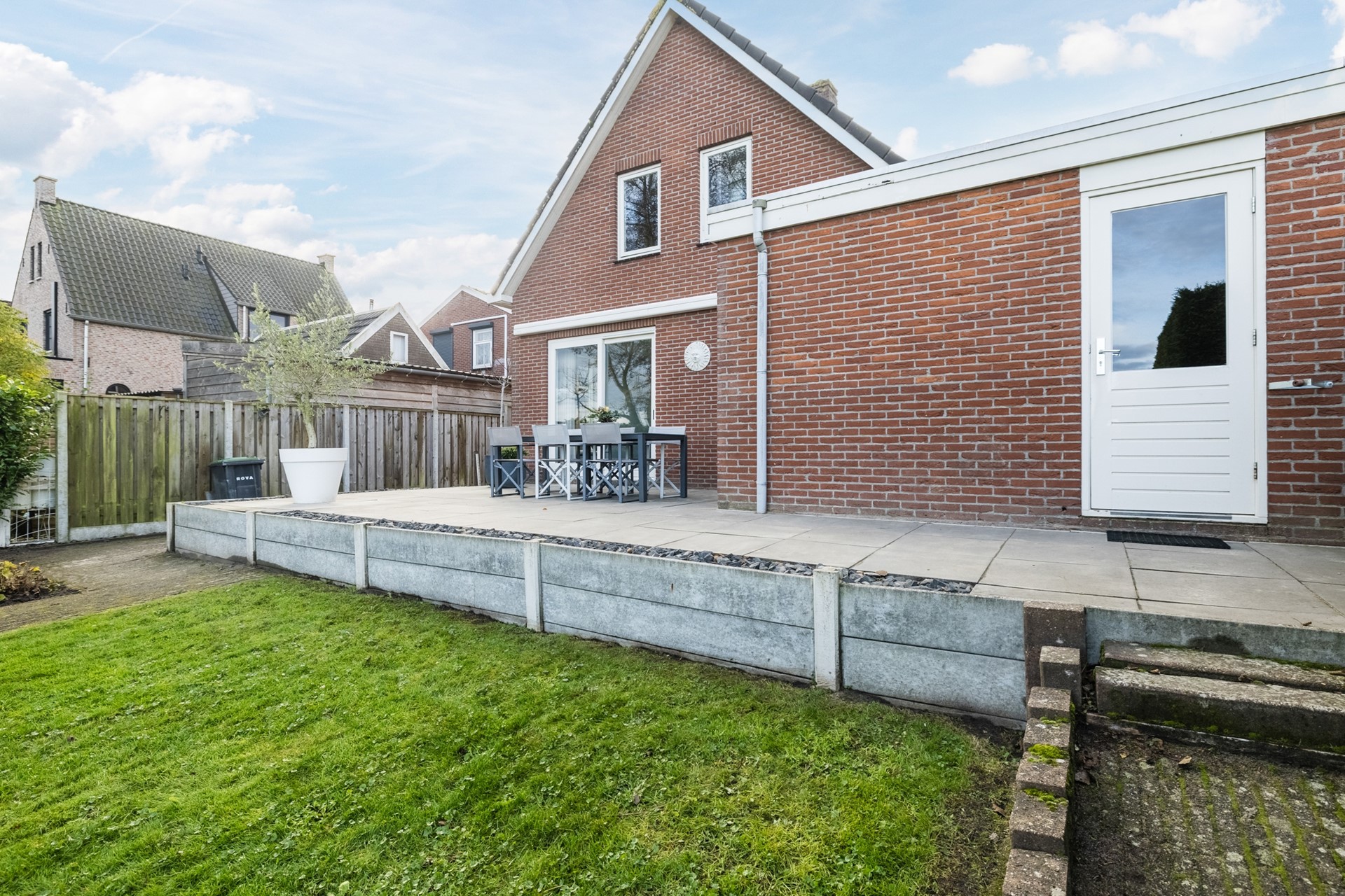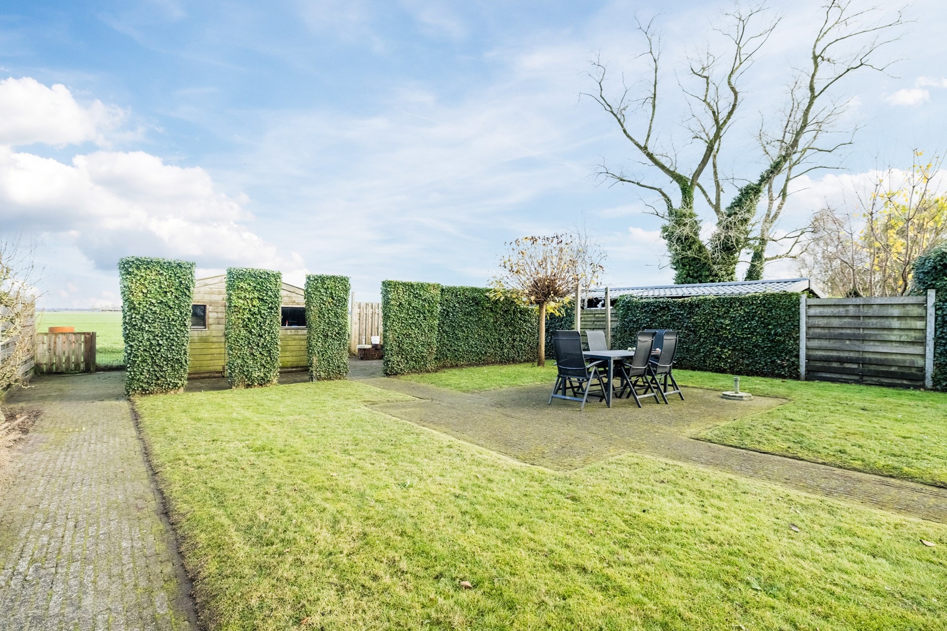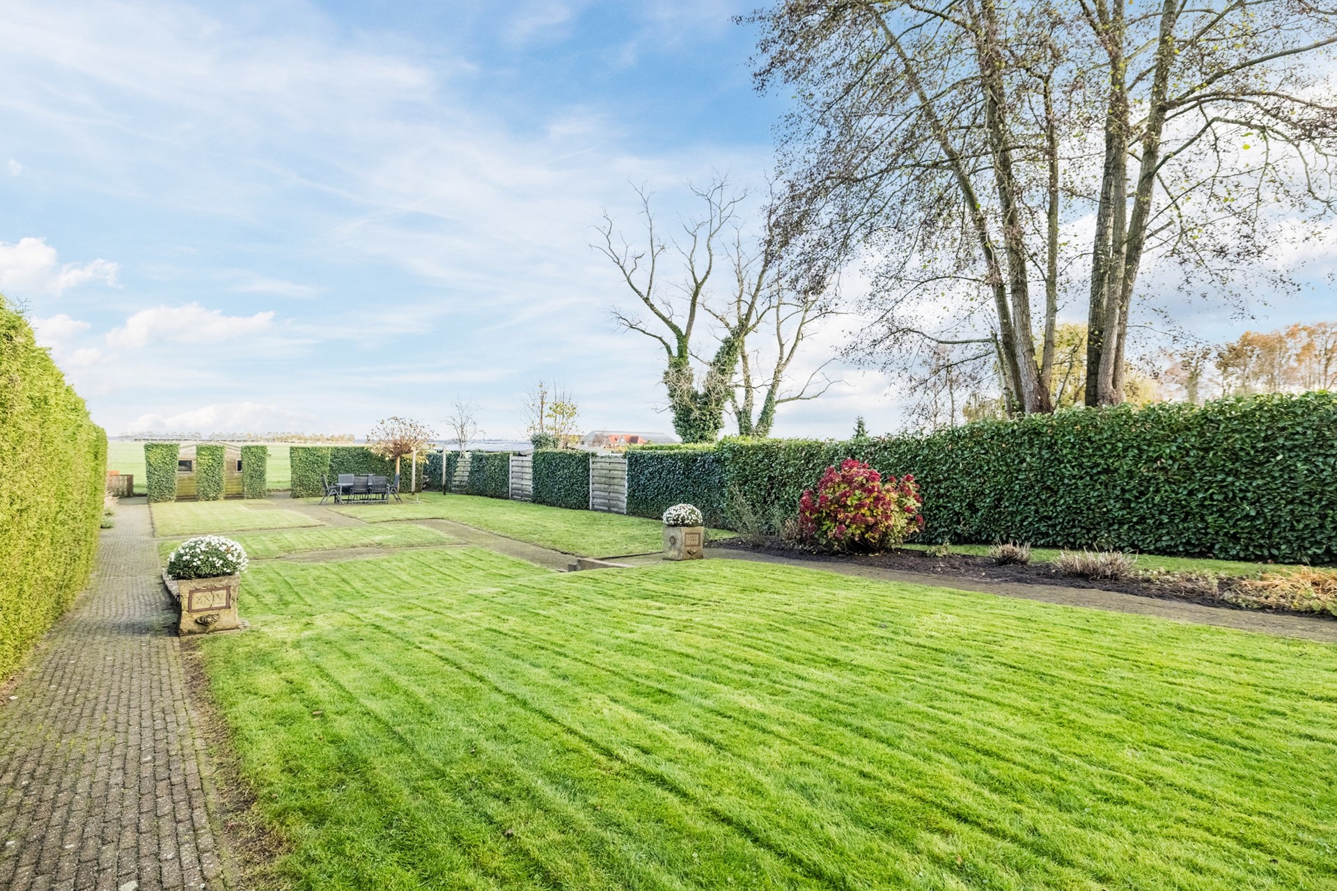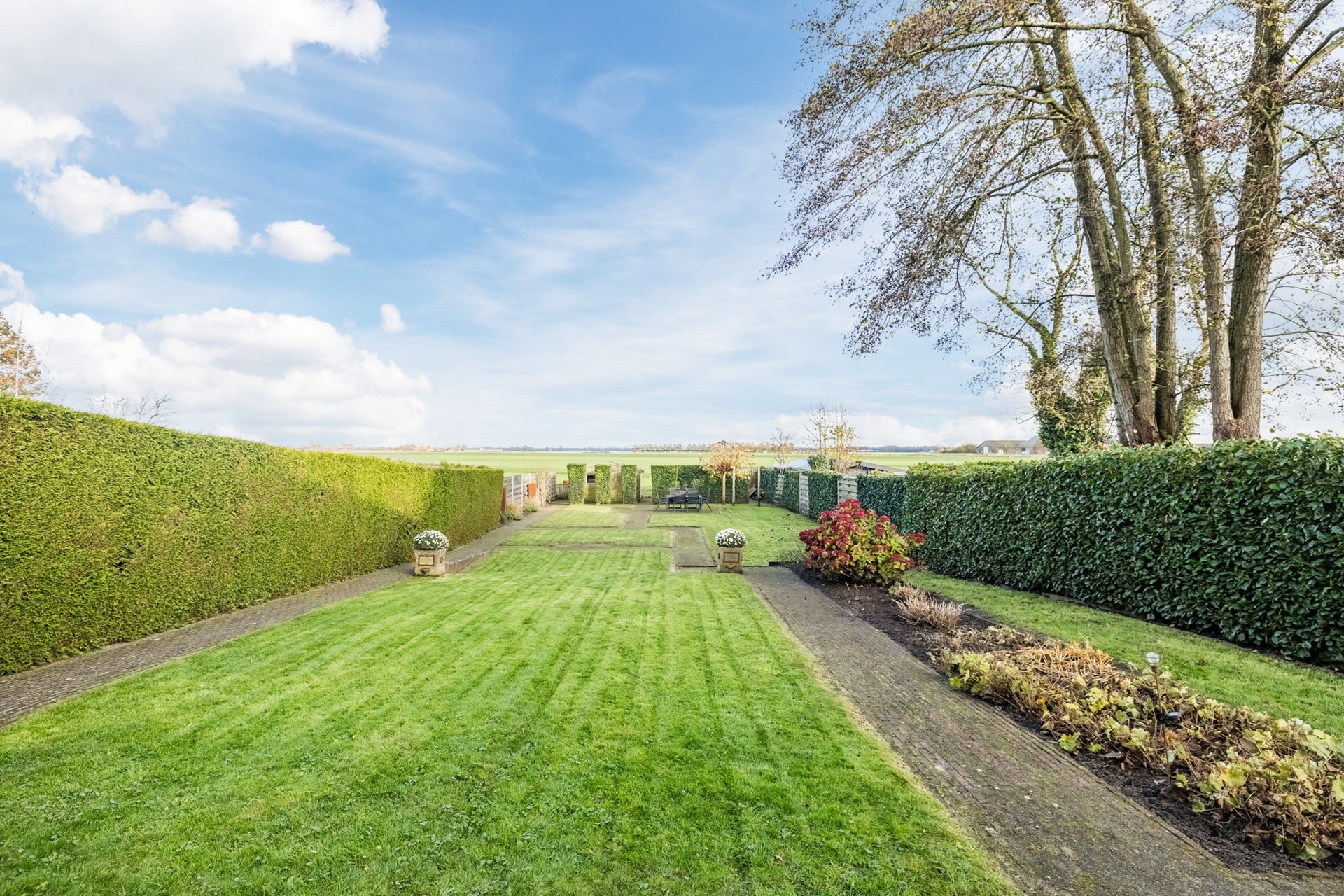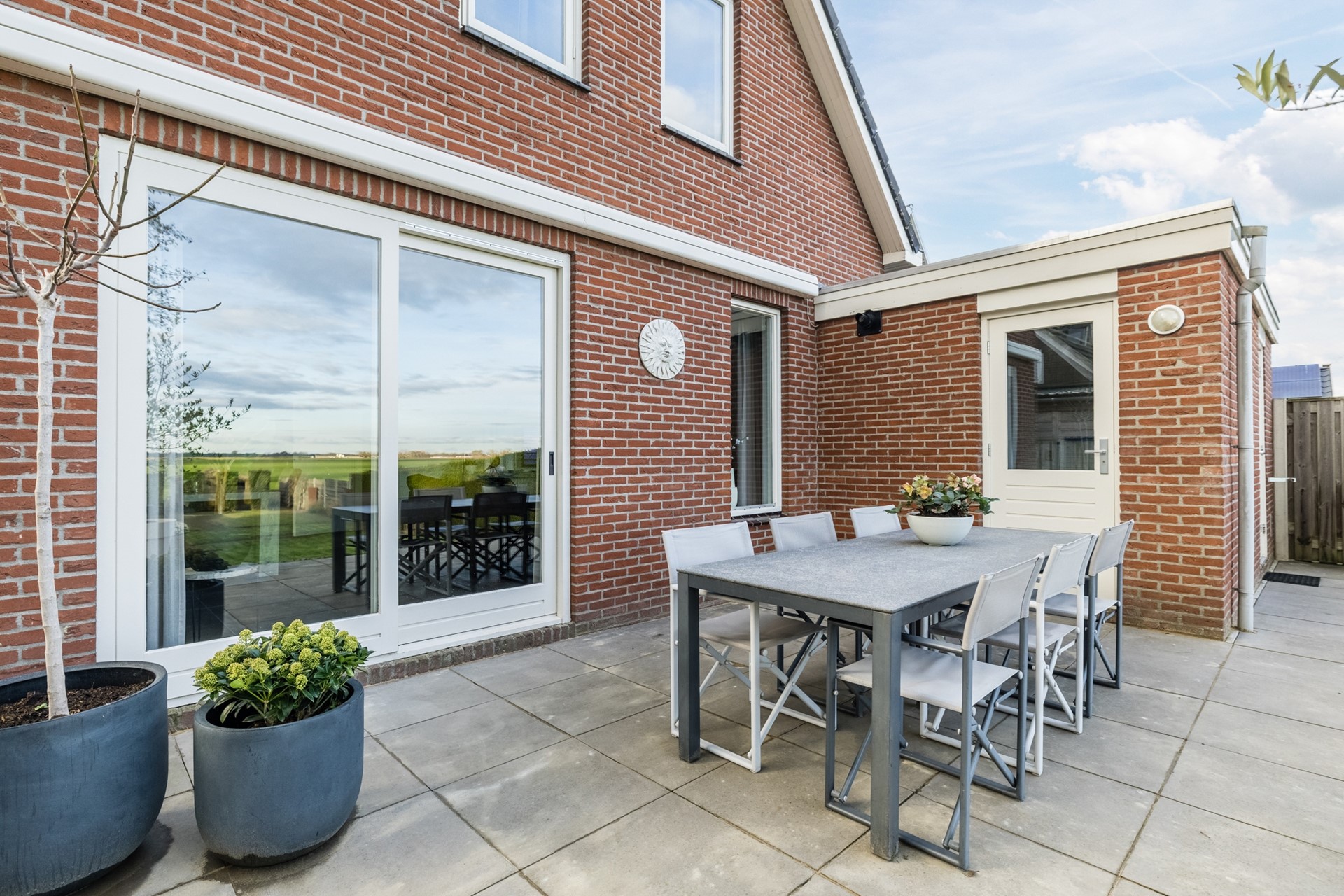 Buiten geniet je van een zonnige tuin met veel privacy, een ruim terras en vrij uitzicht over de landerijen aan de achterzijde. De garage en het tuinhuis bieden volop bergruimte of mogelijkheden voor hobby’s.