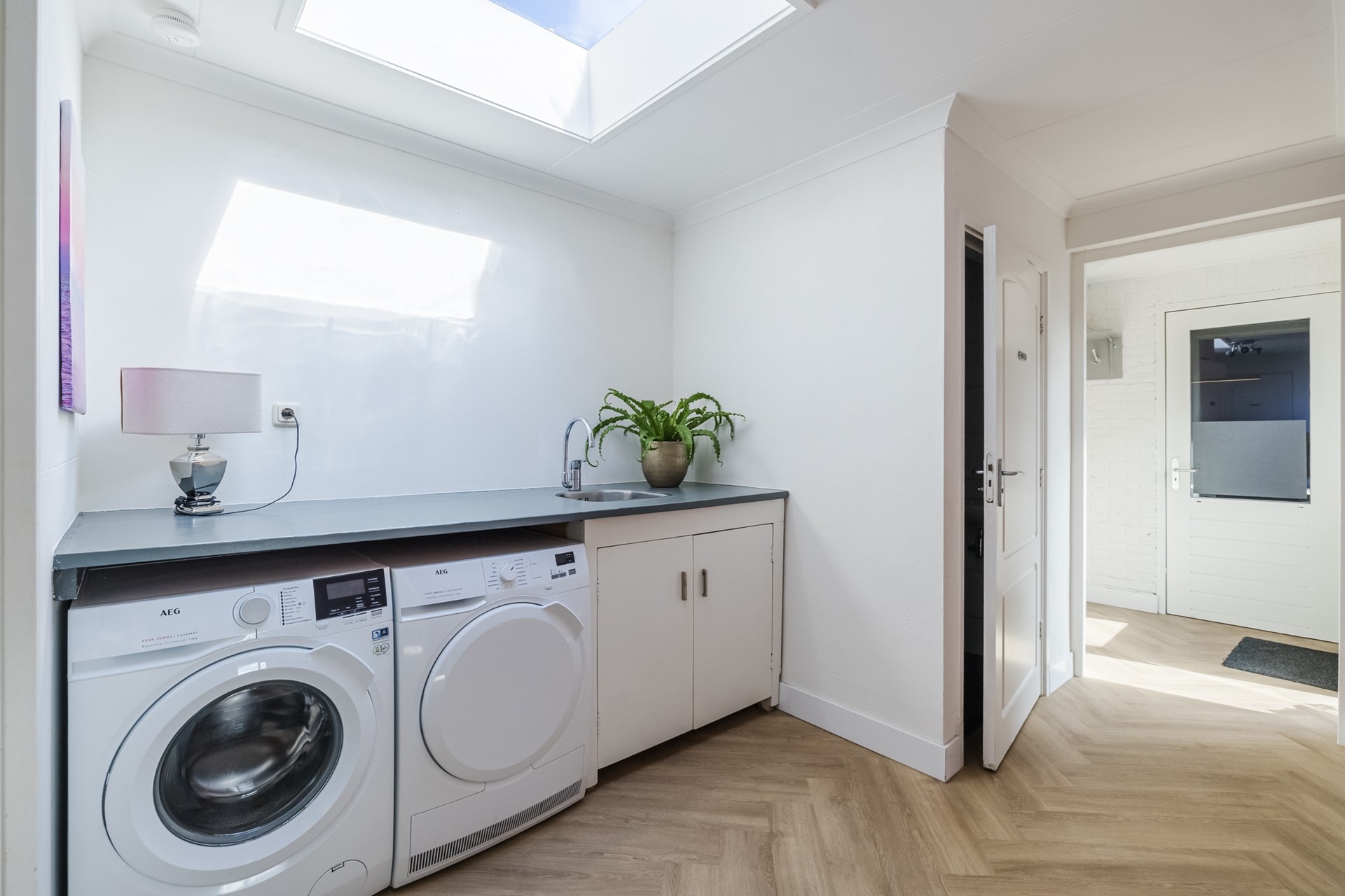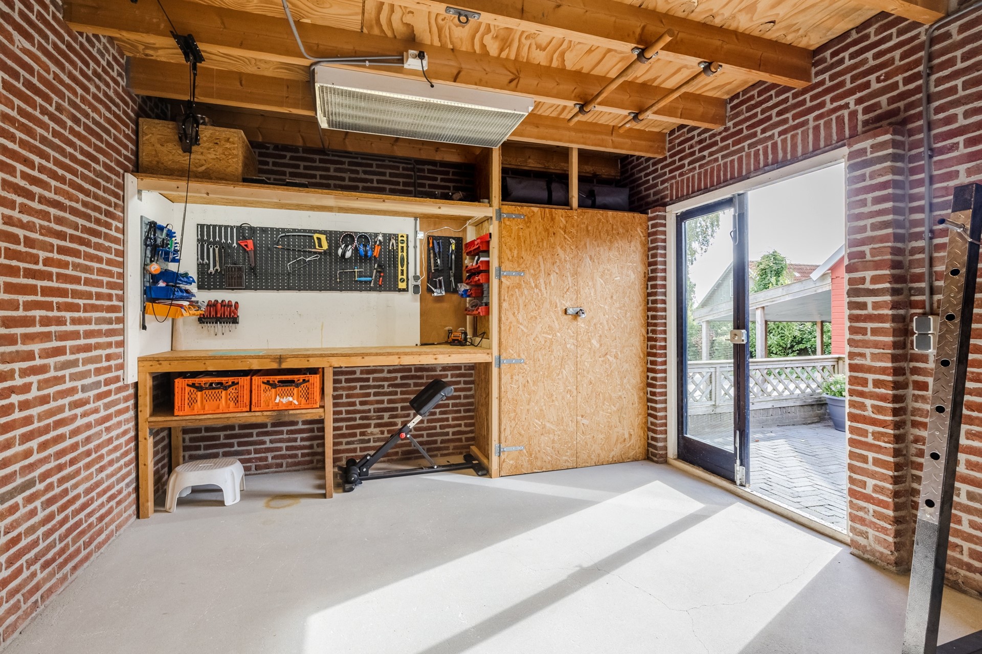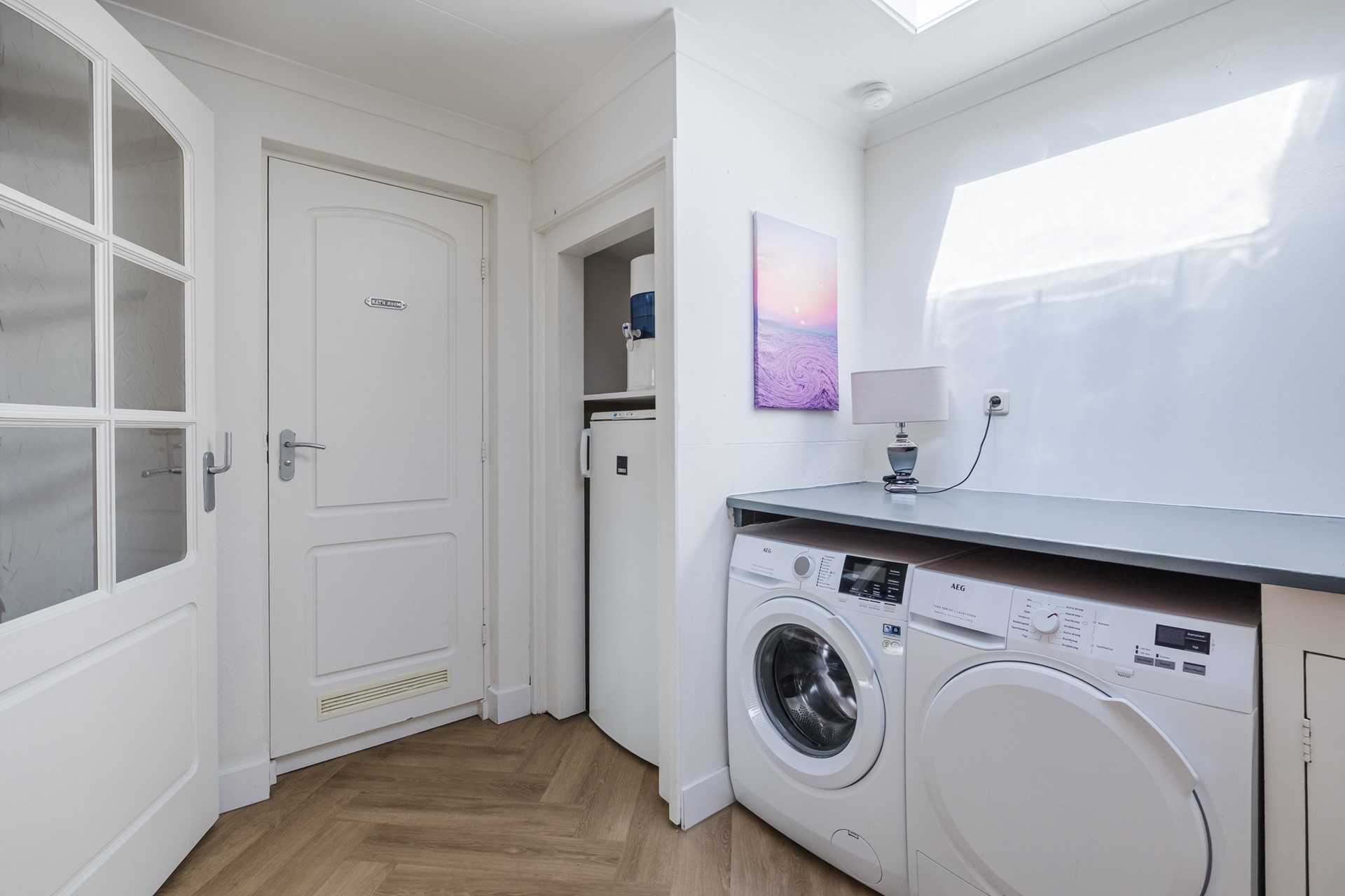 cv-ketel (2025) en toegang tot ruime half verdiepte kelderruimte, dichte woonkeuken met tuindeuren naar terras en moderne, luxe inbouwkeuken voorzien van alle noodzakelijke inbouwapparatuur, bijkeuken met opstelplaats wasmachine/droger, badkamer met douche-inrichting, ligbad en wastafelmeubel, afzonderlijk toilet met fontein, hal met kastruimte en achteringang, kantoorruimte, schuurruimte/hobbyruimte met vaste trap naar royale zolderruimte.