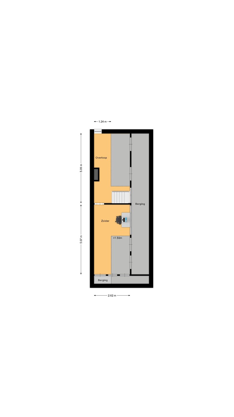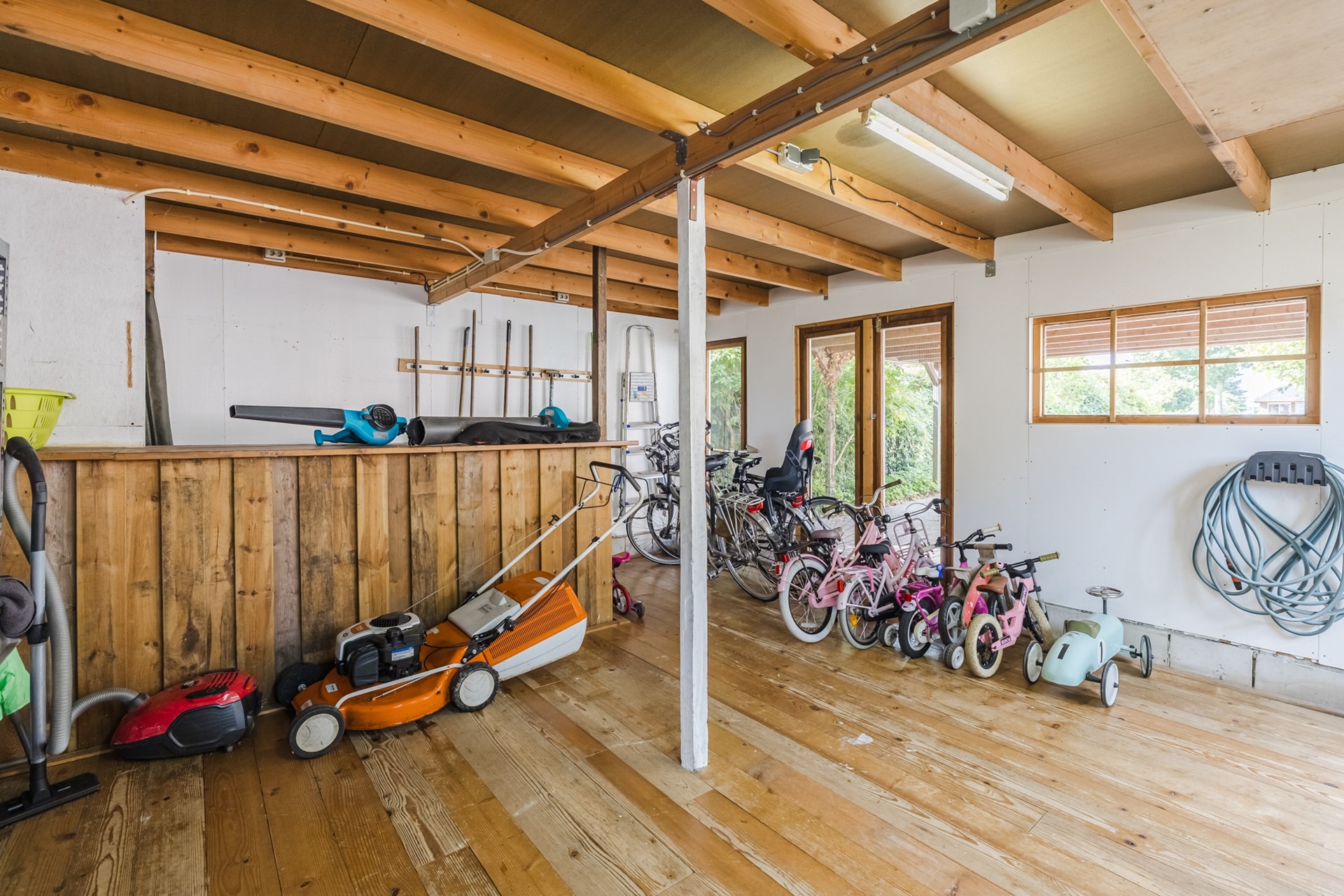 - Vrijstaande houten schuur met een inwendige afmeting van ca. 4.85 x 5.87 meter met zolderruimte met een breedte van 6.05 x 1.65 meter op 1.50 hoogte.