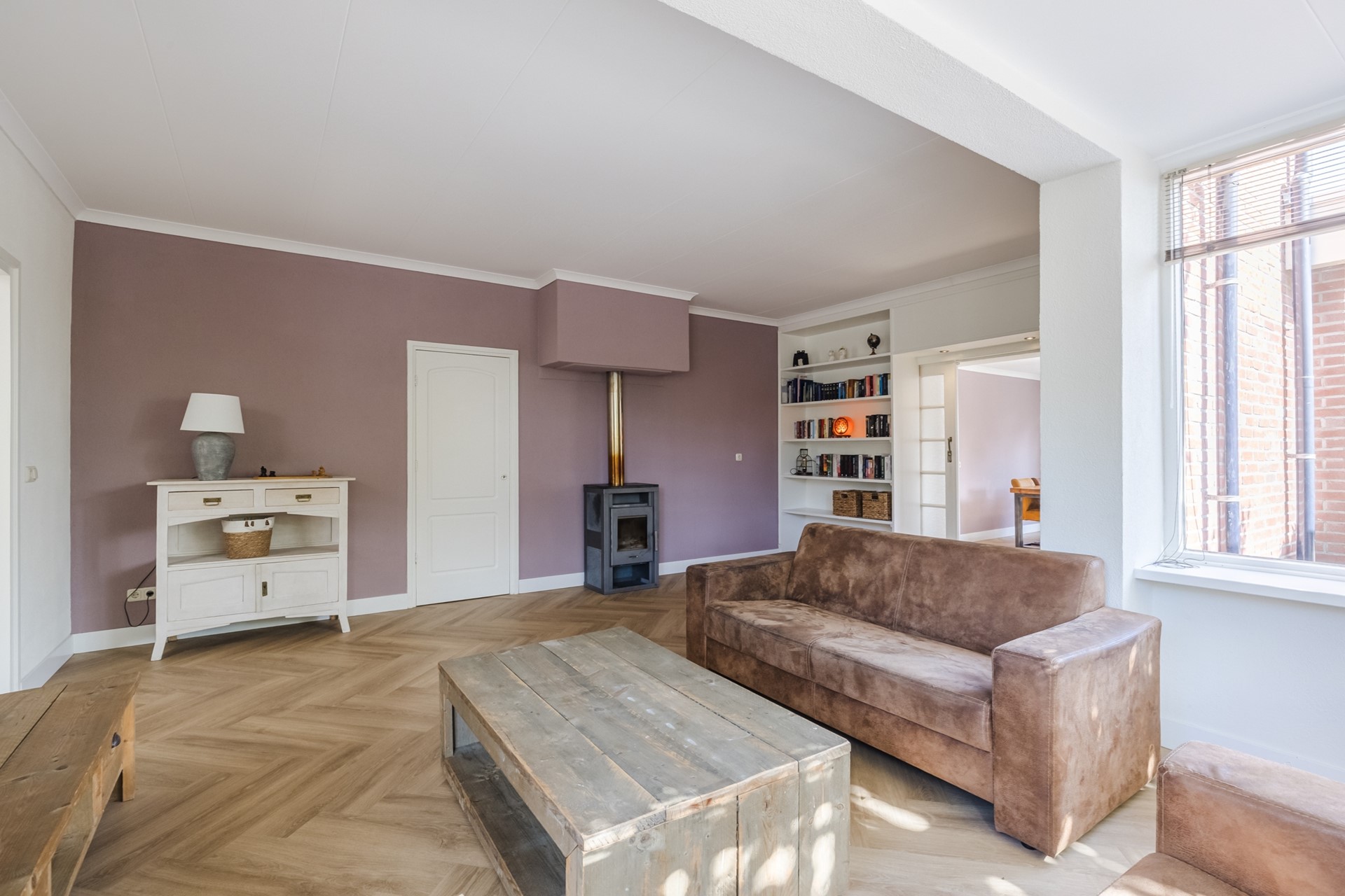 Ruime entree/hal, trapopgang naar 1e verdieping, meterkast, ruime living met erker en houtkachel, portaal met opstelplaats