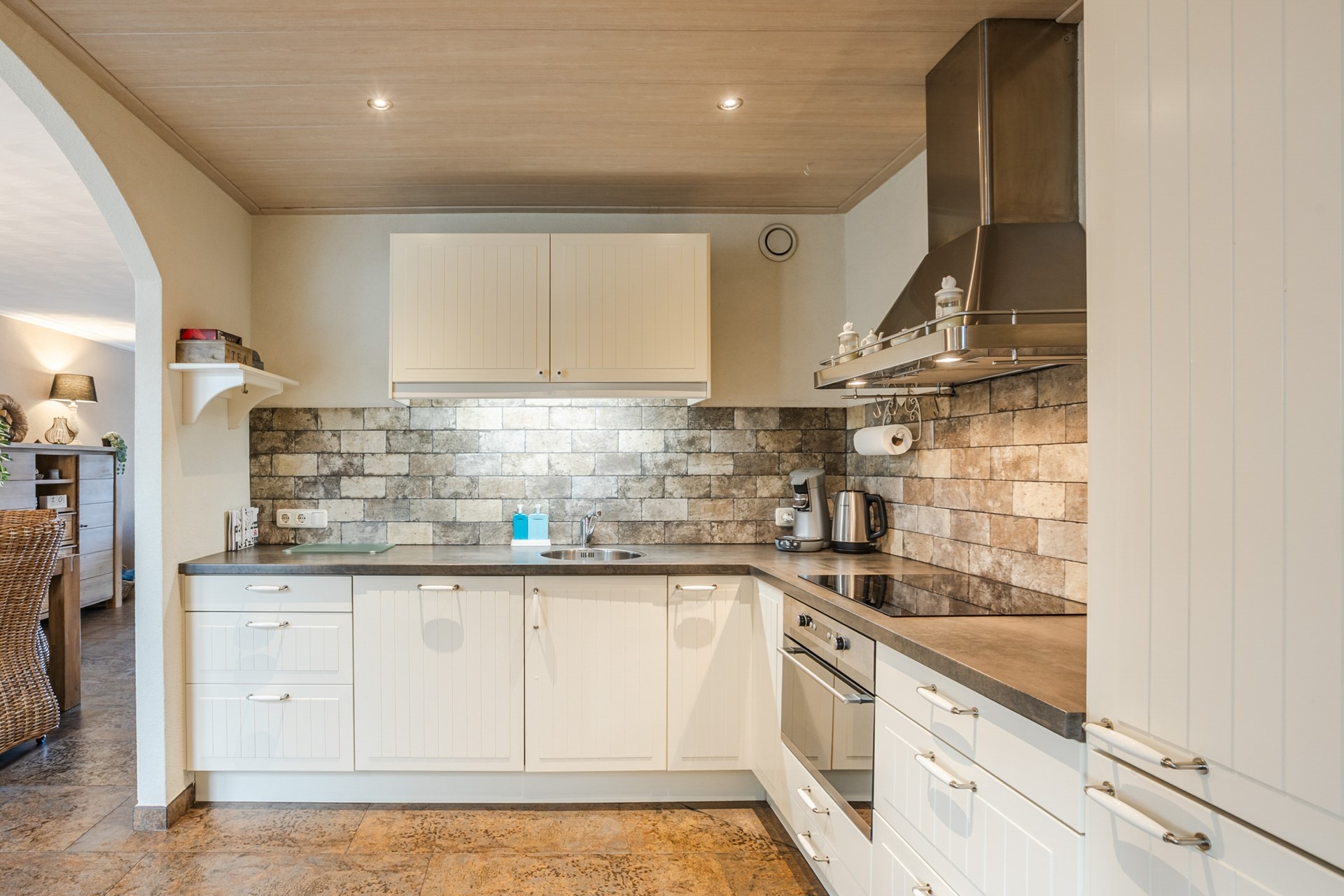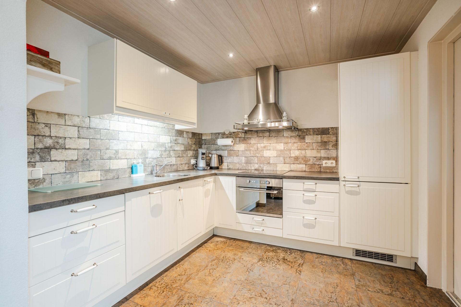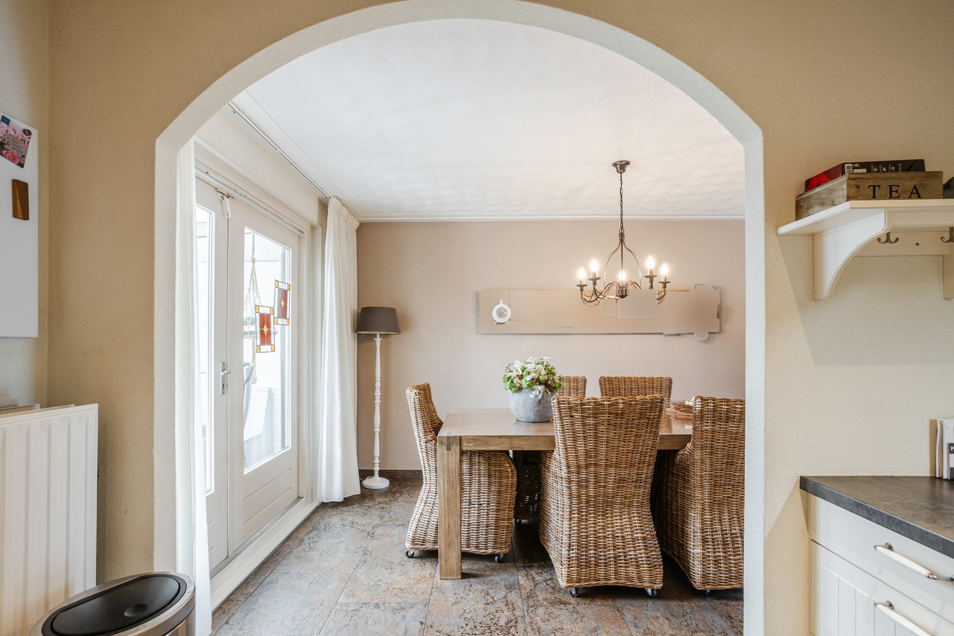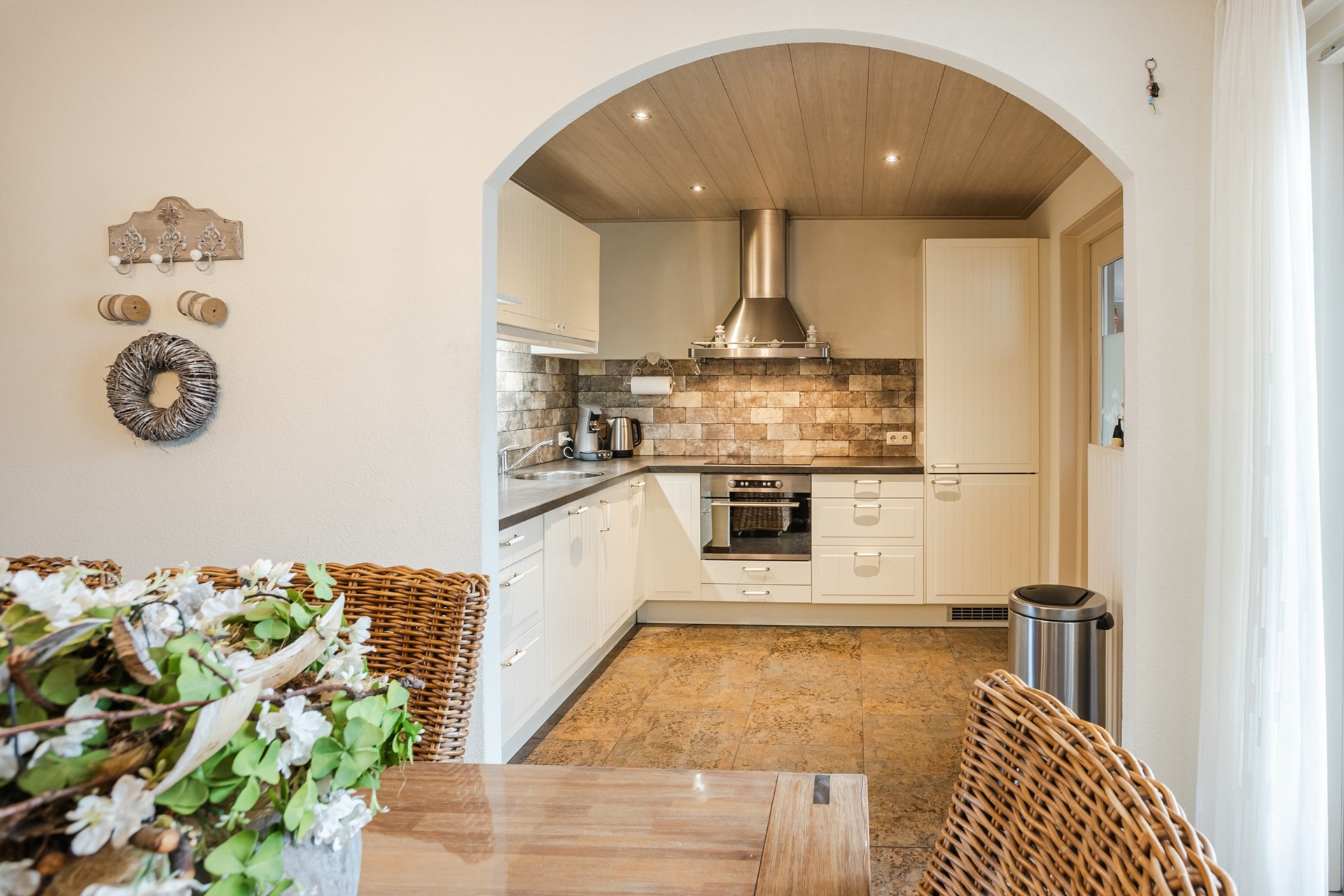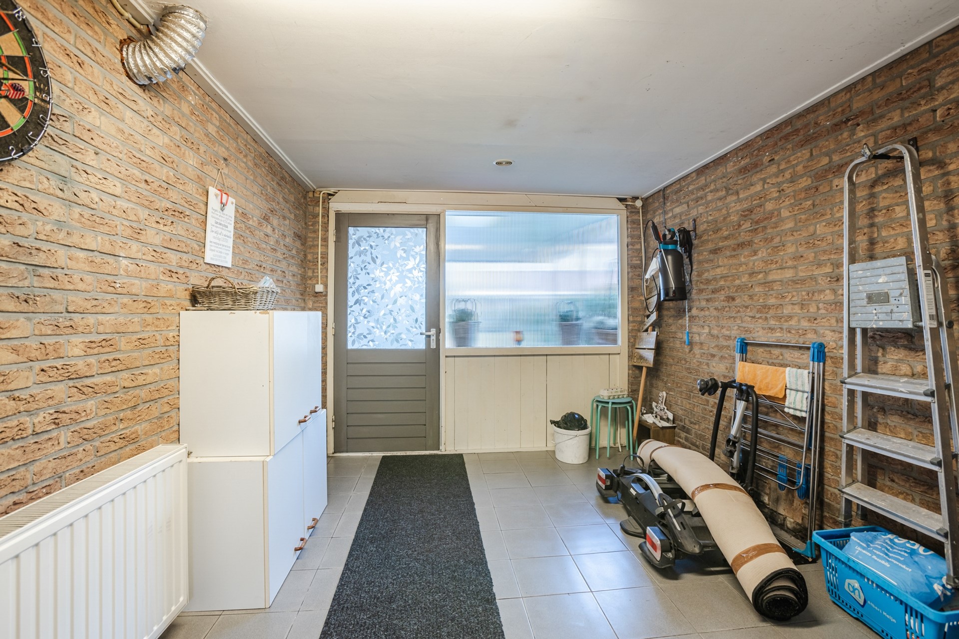 Entree, garderobe, trapopgang, wandcloset met fontein, meterkast, L-vormige woonkamer met tuindeuren, halfopen keuken met L-vormige inbouwkeuken (2013) voorzien van diverse inbouwapparatuur, riante verwarmde bijkeuken 2.54 x 5.56 meter met 2 vaste kasten en deur naar tuin en deur naar verwarmde berging 2.92 x 3.87 meter