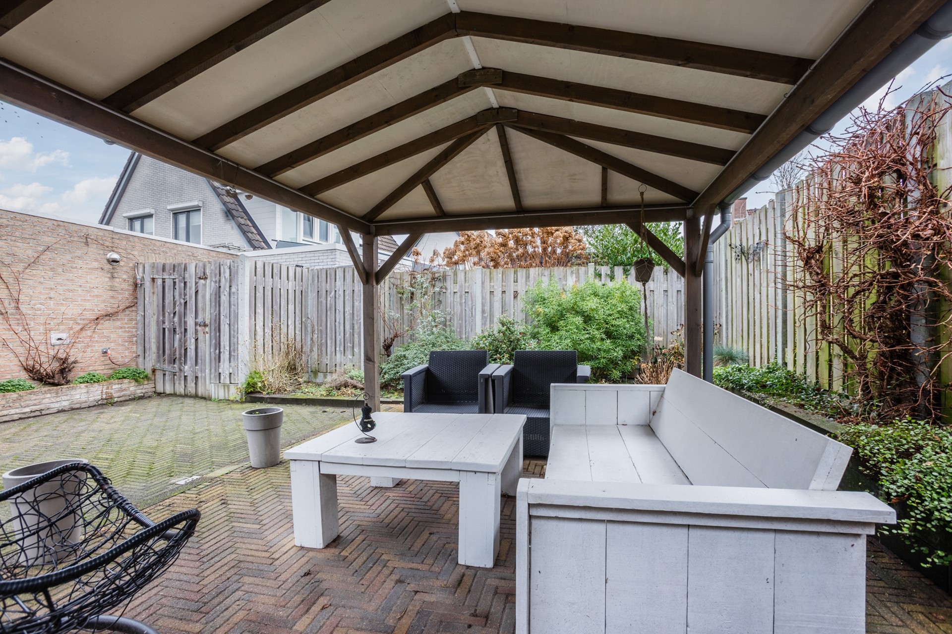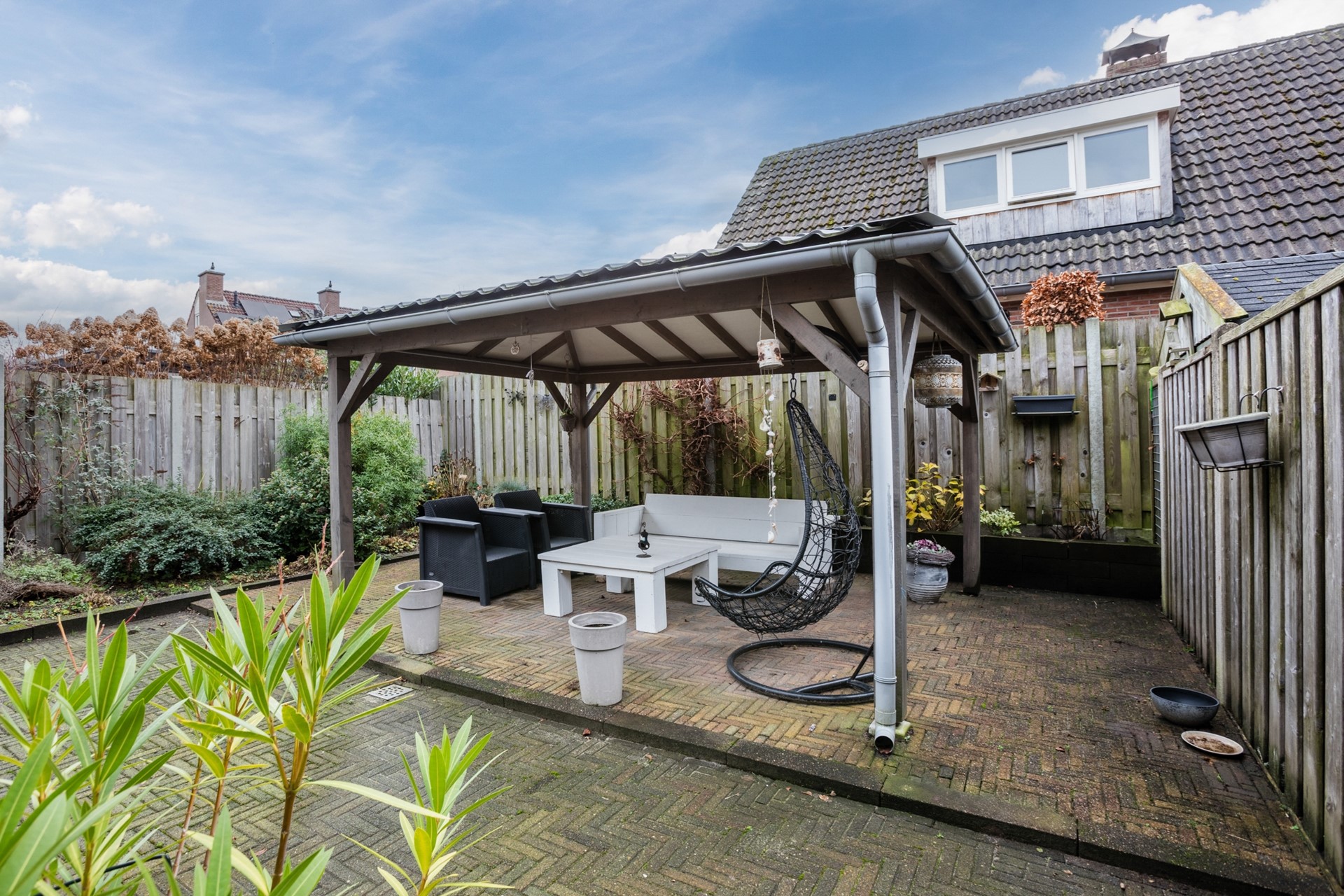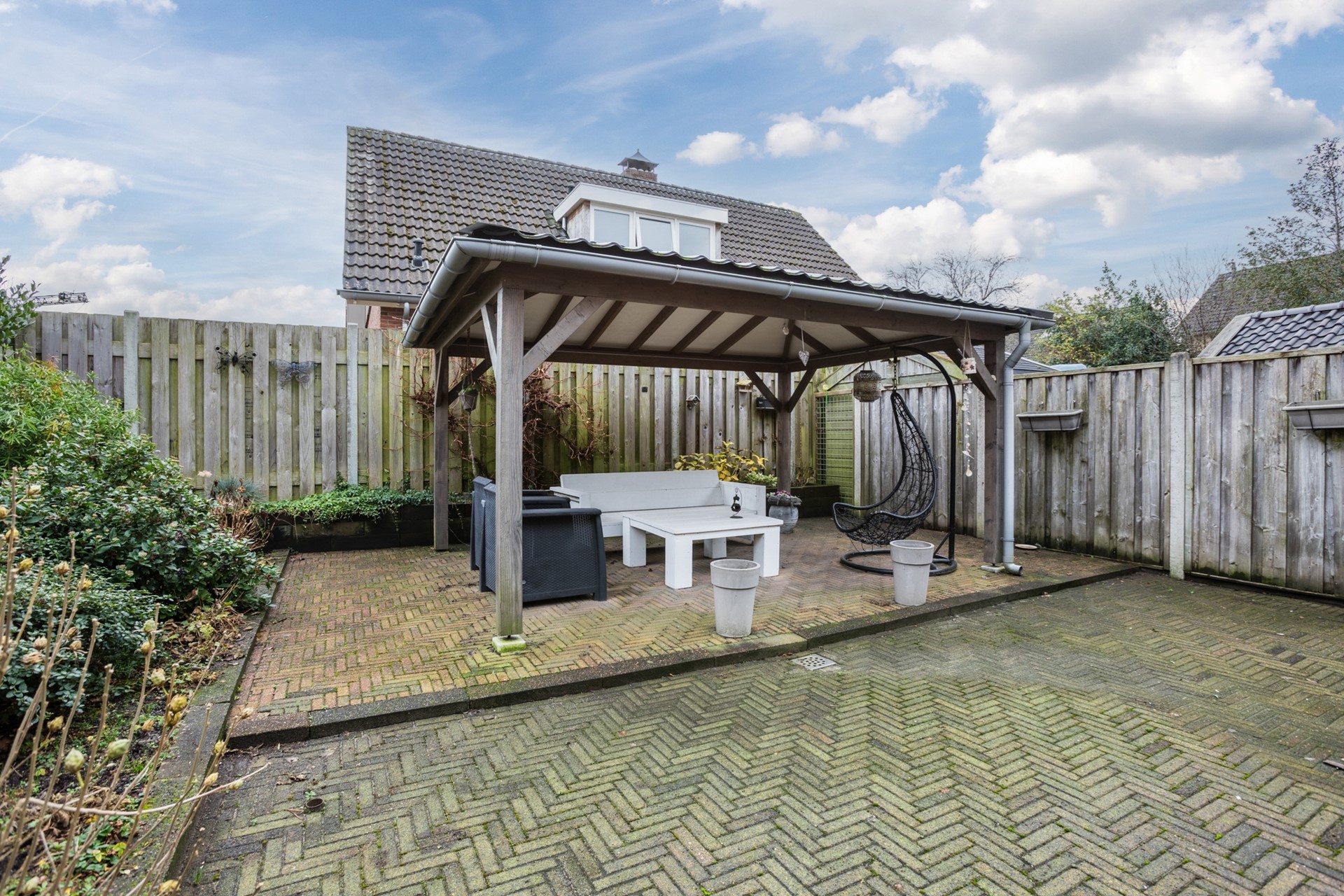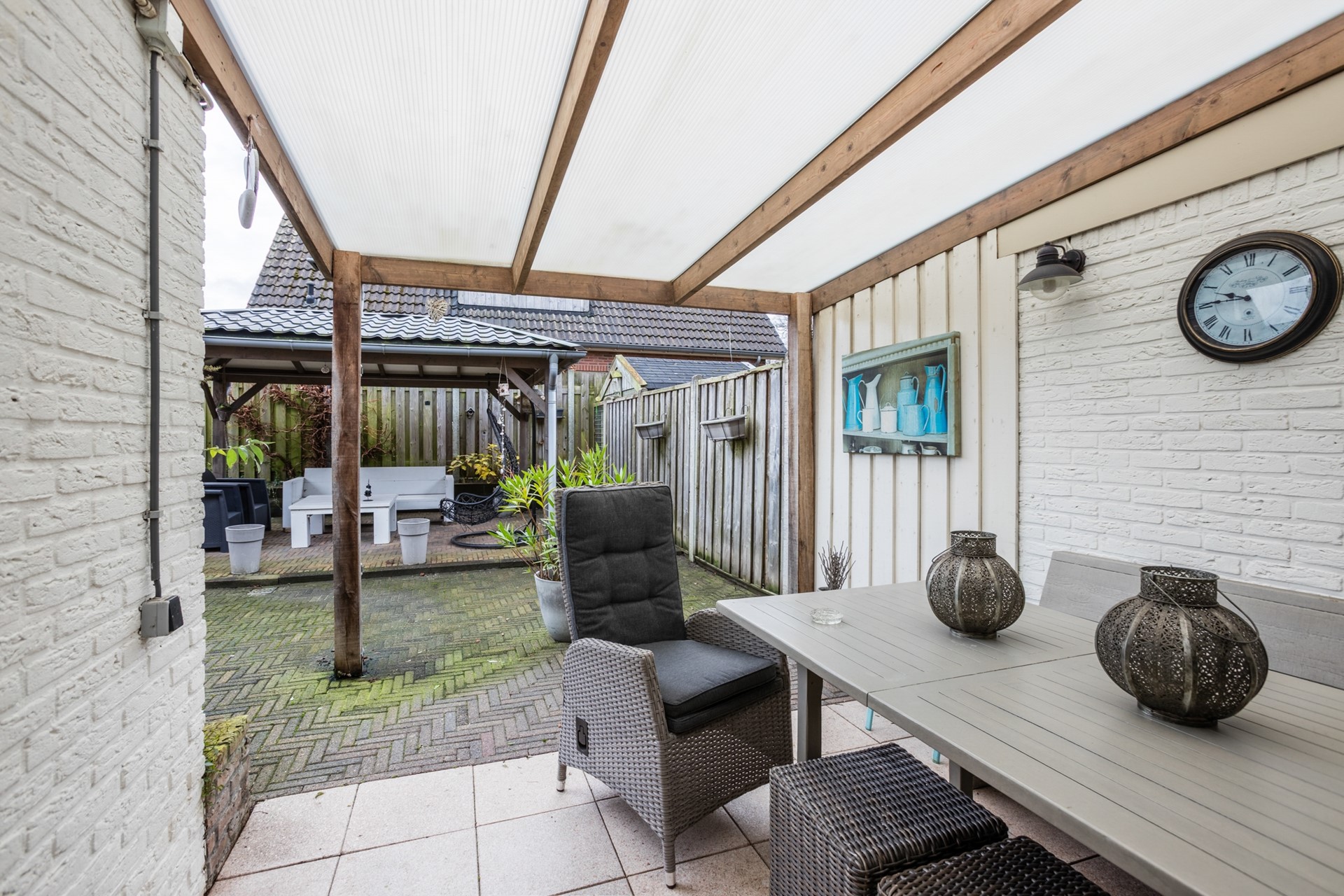De achtertuin ligt op het zuidoosten, is onderhoudsvriendelijk aangelegd en voorzien van een aangebouwde- én een vrijstaande terrasoverkapping, waardoor je het hele jaar door comfortabel buiten kunt zitten.
