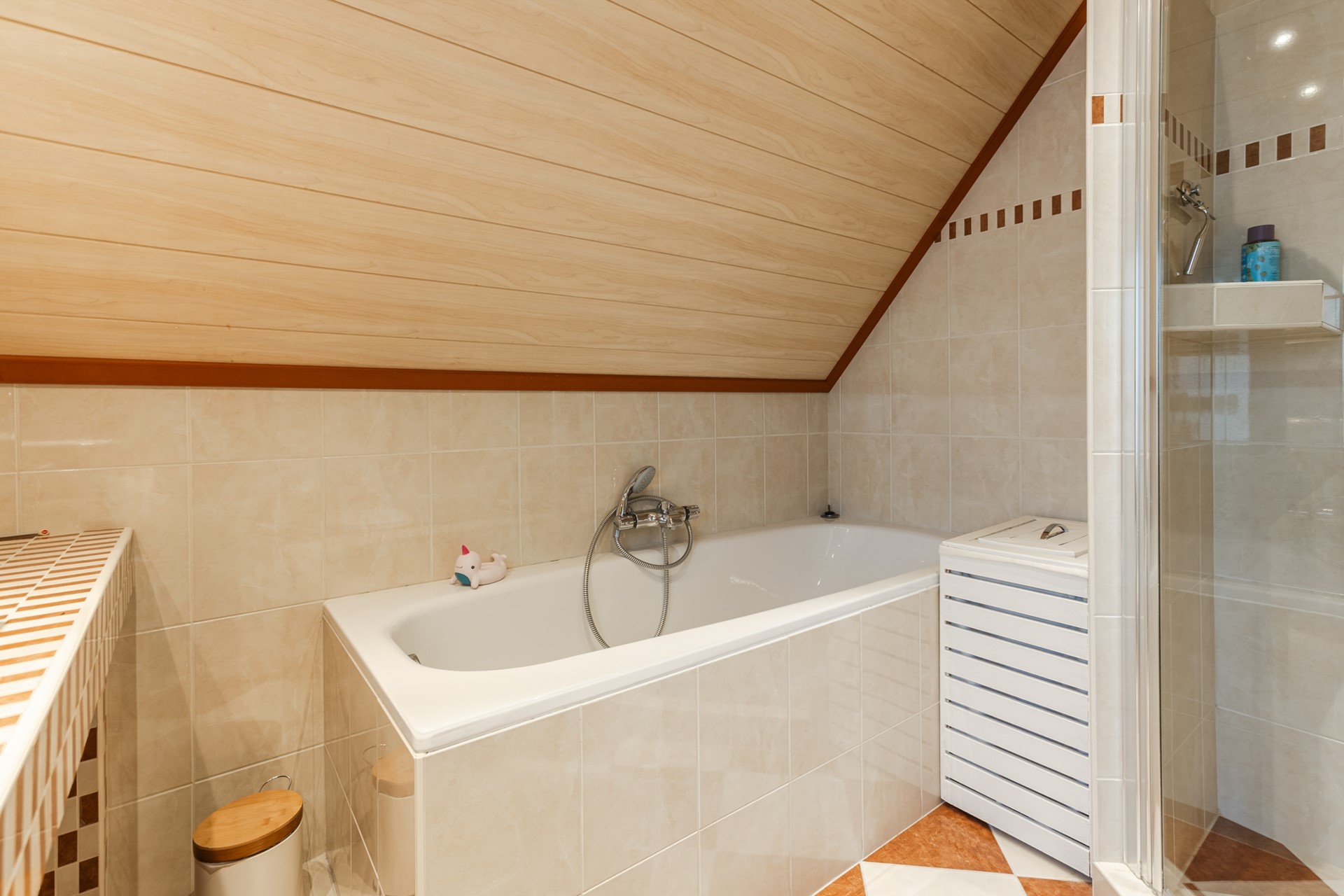Overloop met trapopgang naar 2e verdieping, 3 slaapkamers waarvan 1 met een dakkapel, badkamer (2004) met wandcloset, douche-inrichting met douche-deur, ligbad en wastafelmeubel.