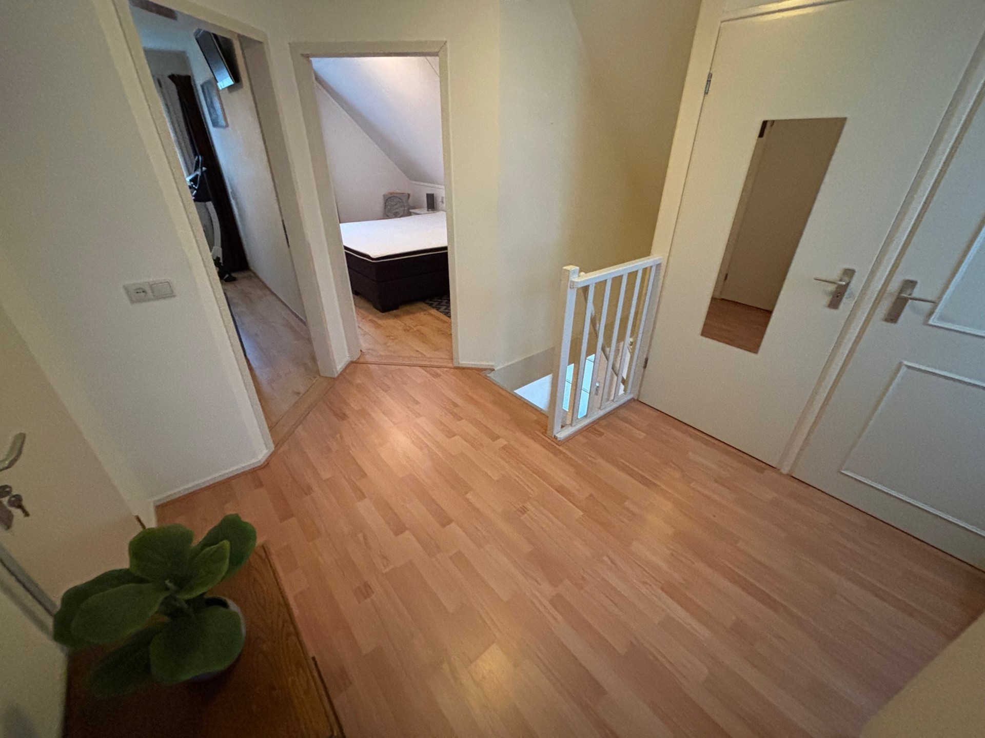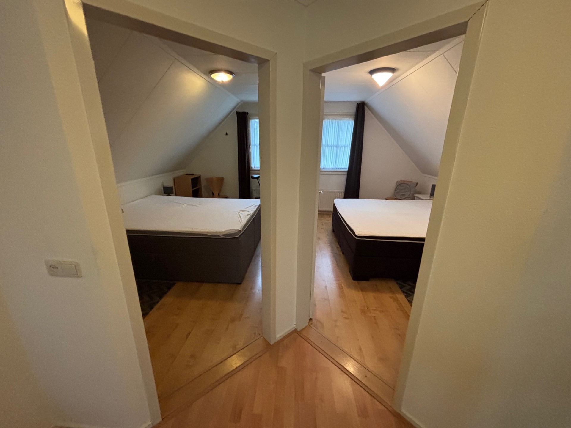 Royale overloop met extra wandcloset, 3 vaste kasten en bergruimte achter de knieschotten, 2 ruime slaapkamers waarvan 1 met bergruimte achter de knieschotten.
