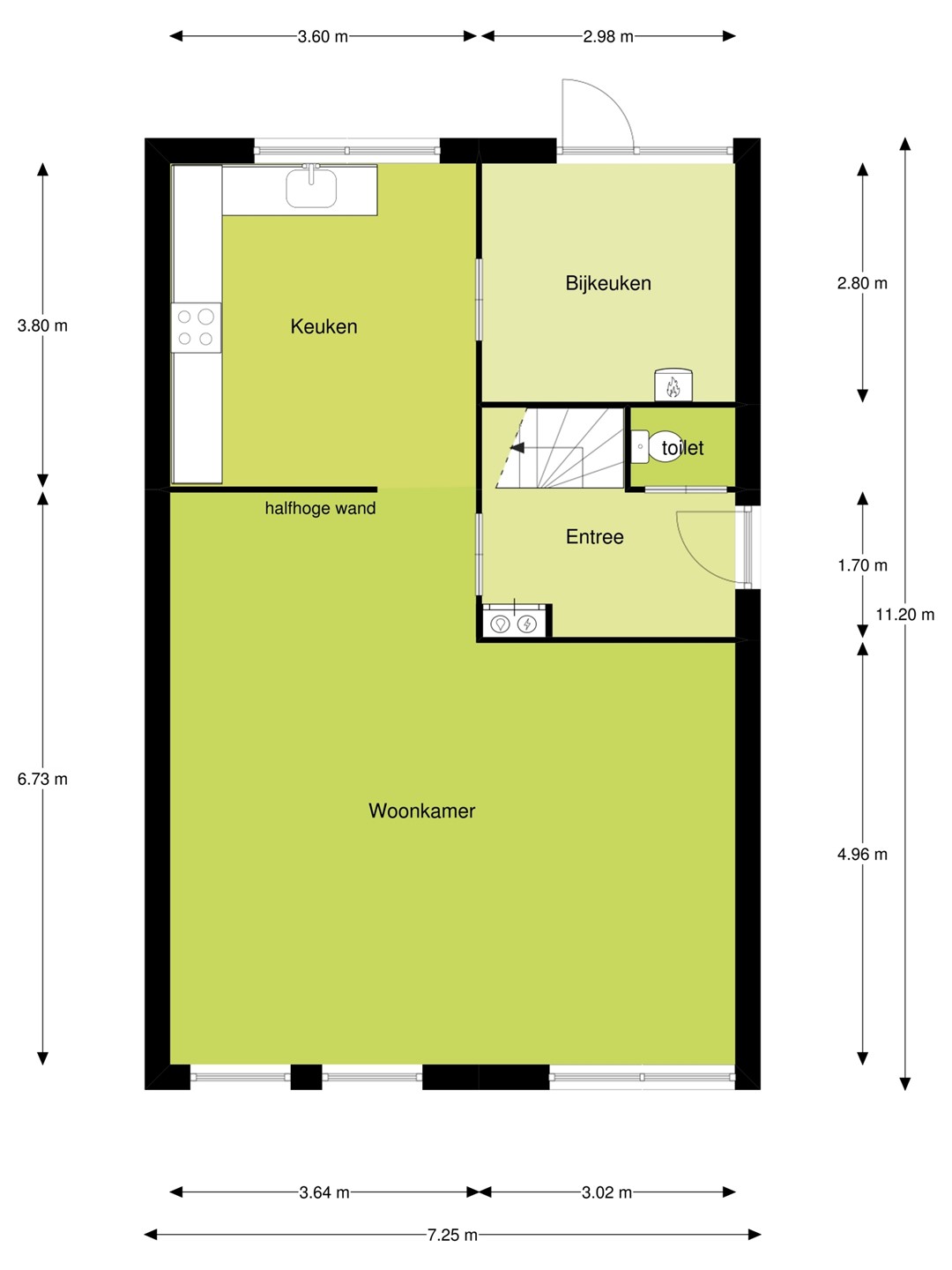 Hal/entree, toilet met fontein, meterkast, trapopgang, royale living met zicht op plantsoen, halfopen keuken met L-vormige inbouwkeuken voorzien van diverse inbouwapparatuur, inpandige bijkeuken met opstelplaats wasmachine/droger, cv-ketel en achteringang.