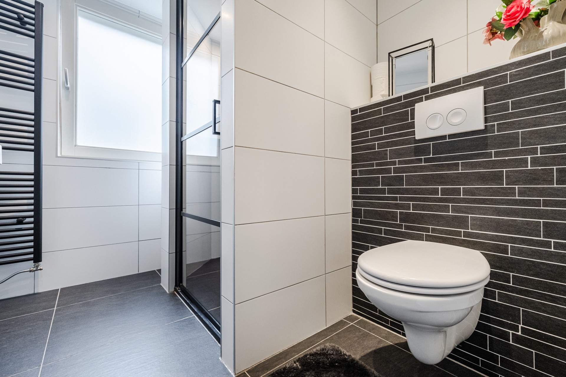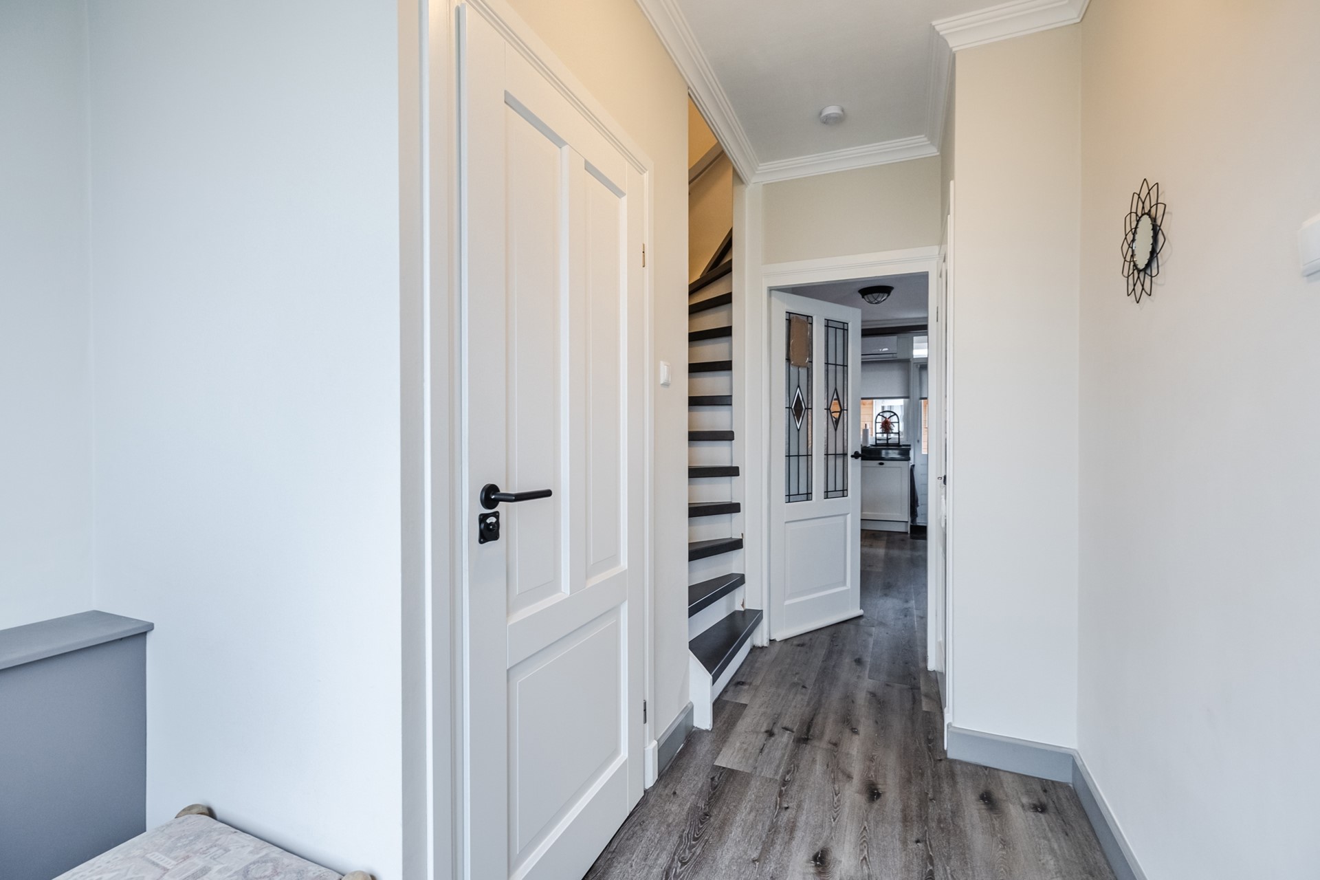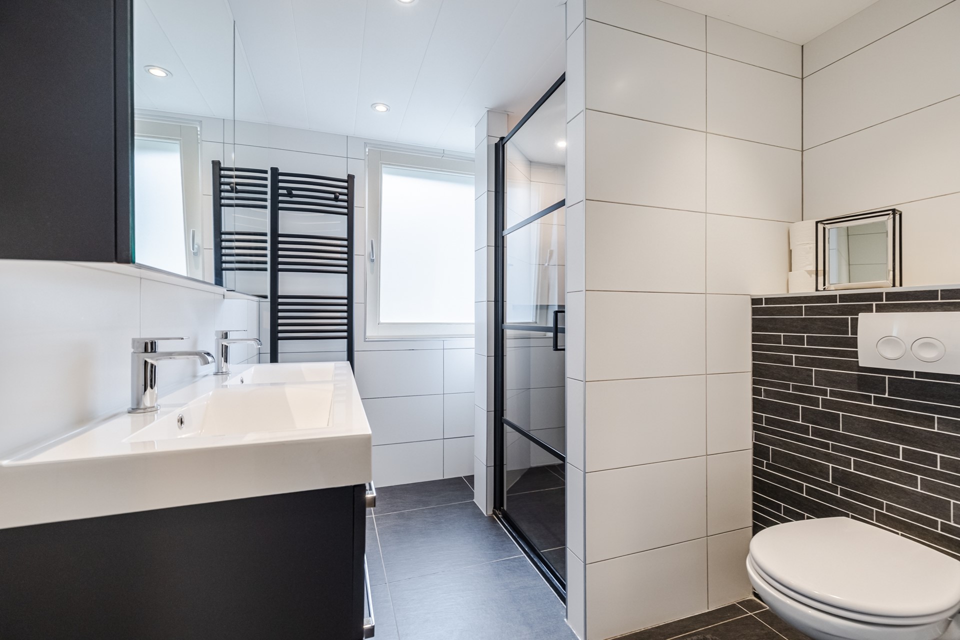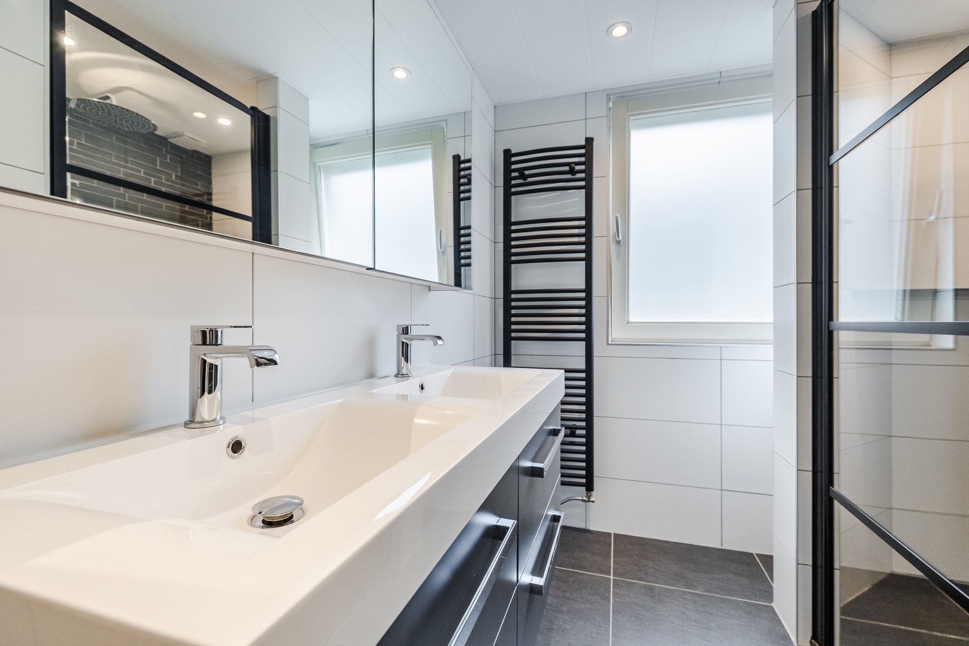 Overloop met 2 vaste kasten, 3 slaapkamers (waarvan 2 met vaste kasten), badkamer (2019) met douche inrichting met drain, dubbel wastafelmeubel, wandcloset en designradiator.