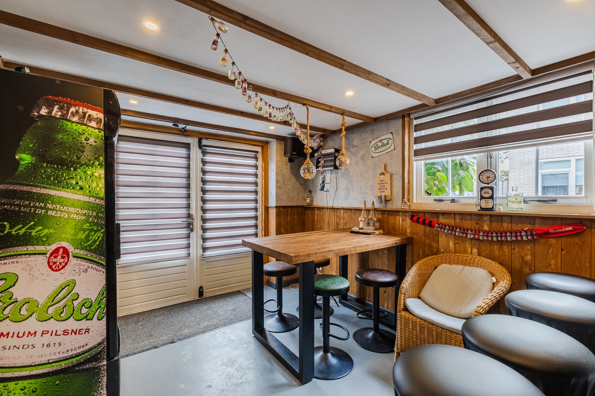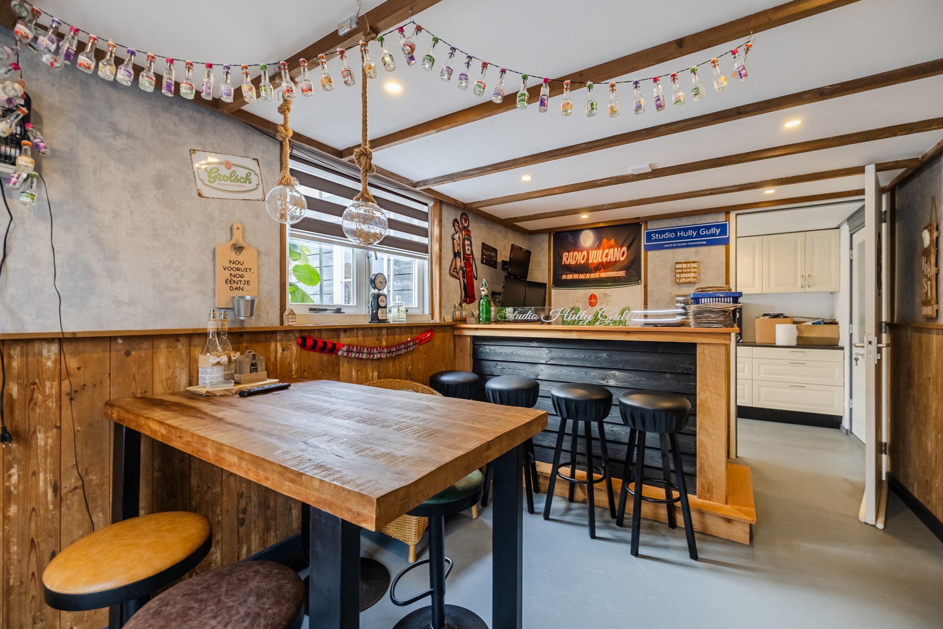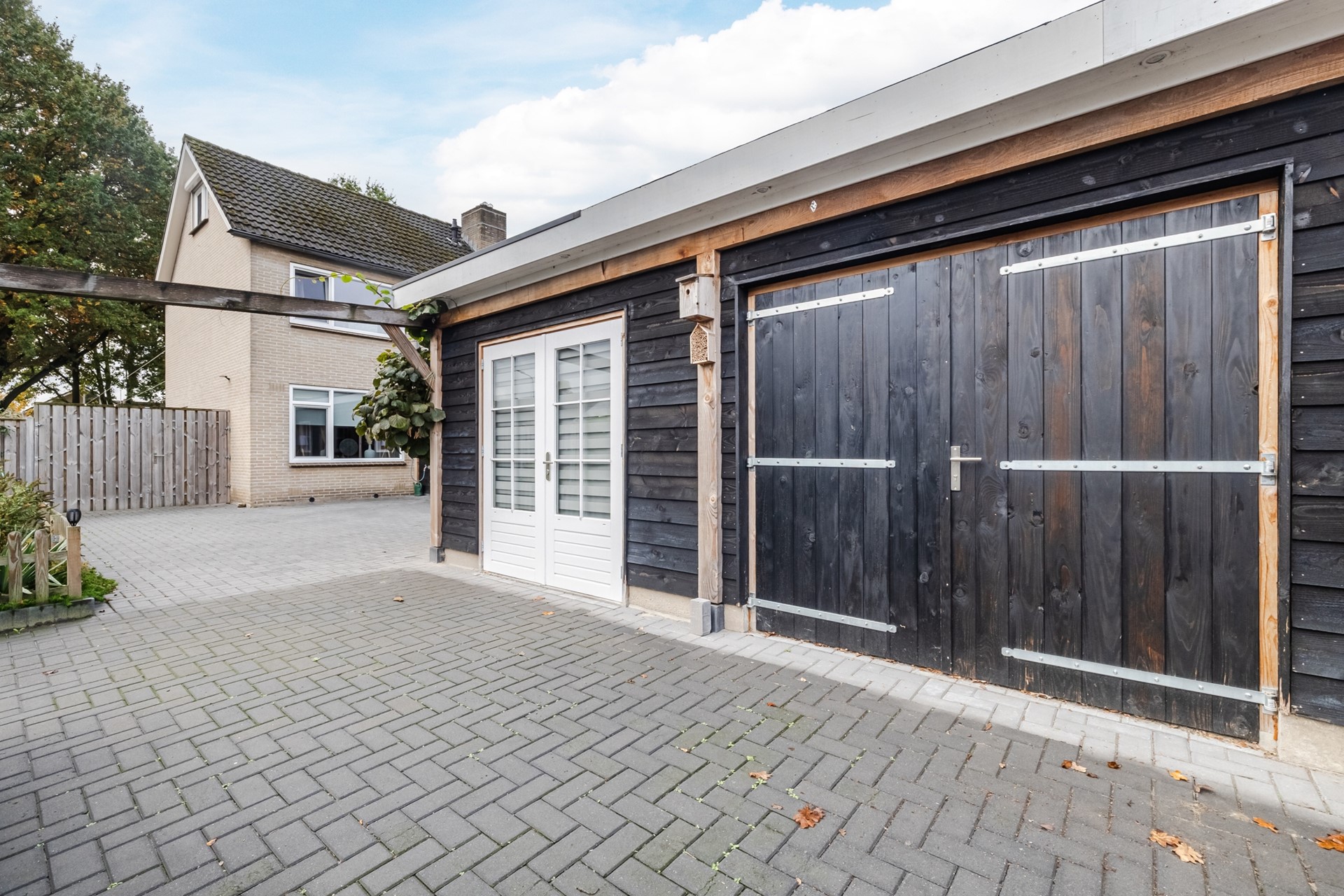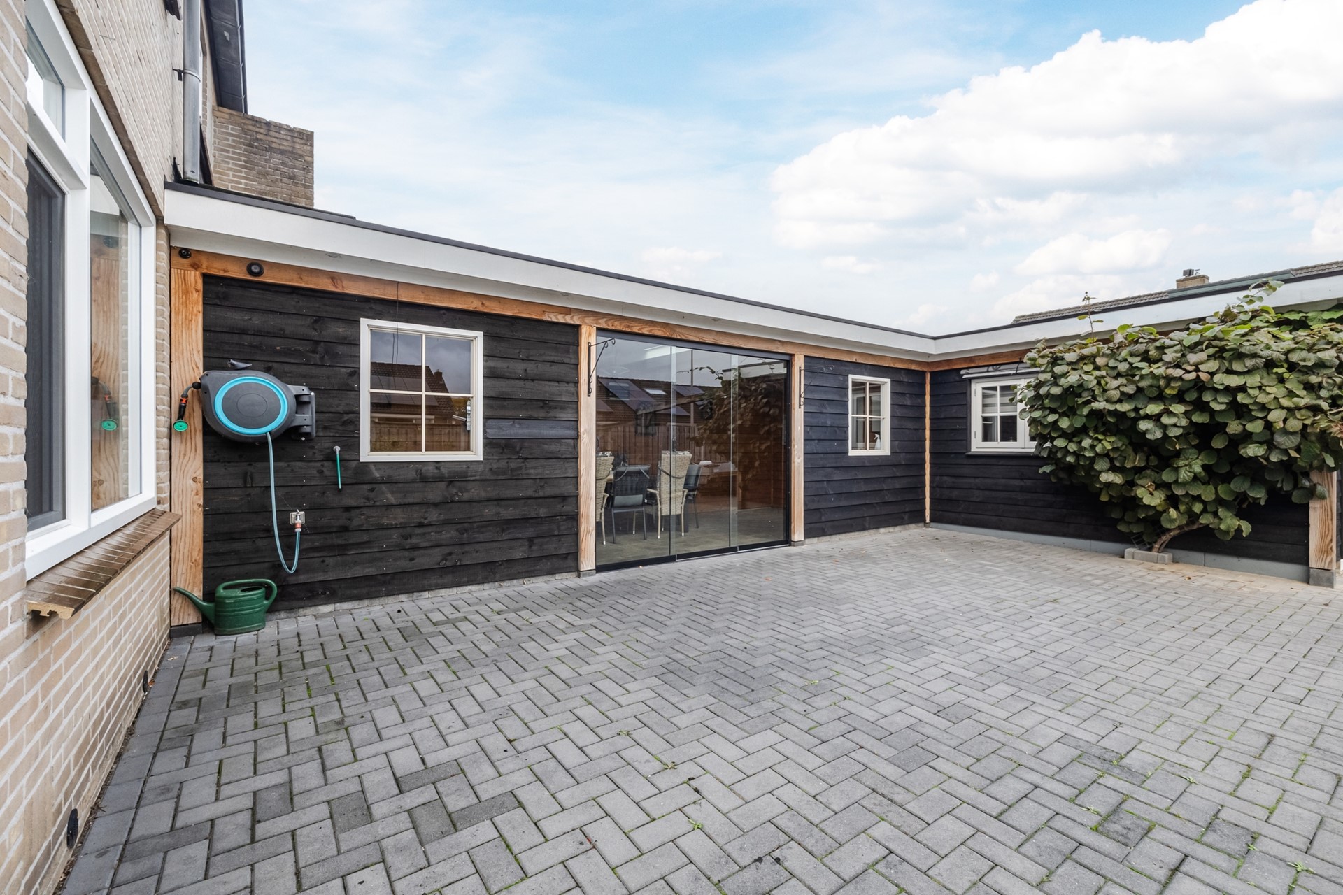 - Aangebouwde bijkeuken met afzonderlijke hobbyruimte/chill-ruimte en aangrenzende garage met een afmeting van ca. 2.89 x 7.07 meter (binnenwerks). - Overkapping (tussen woning en garage) met glazen wanden met een afmeting van ca. 7.49 x 3.09 meter.