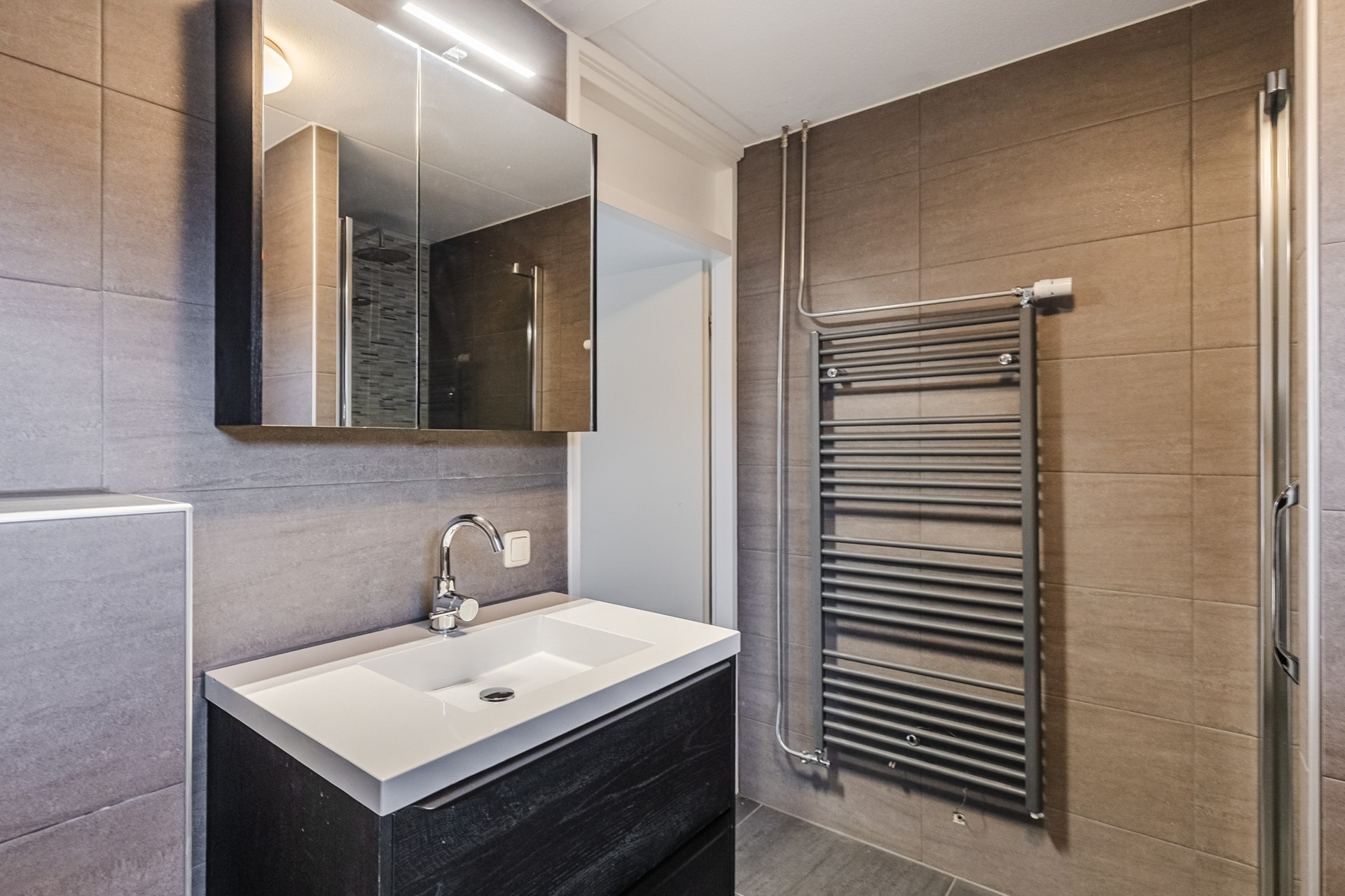 Overloop met trapopgang naar 2e verdieping, 3 ruime slaapkamers waarvan 2 met inbouwkasten en 1 slaapkamer met een balkon aan voorzijde, moderne eigentijdse badkamer met ligbad, inloopdouche met douchedeur, 2e wandcloset, wastafelmeubel en designradiator.