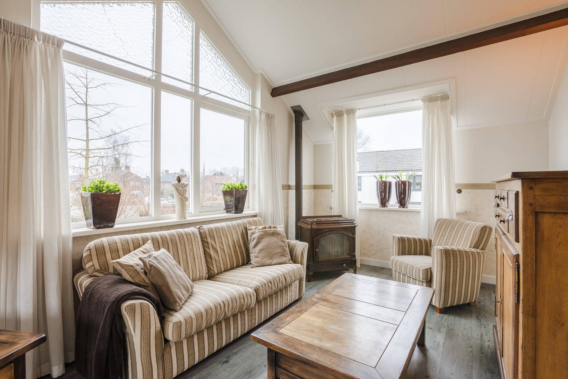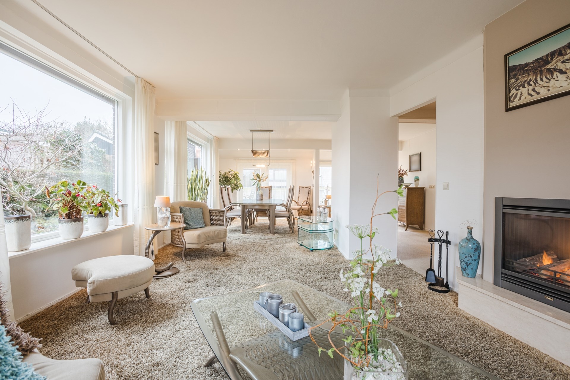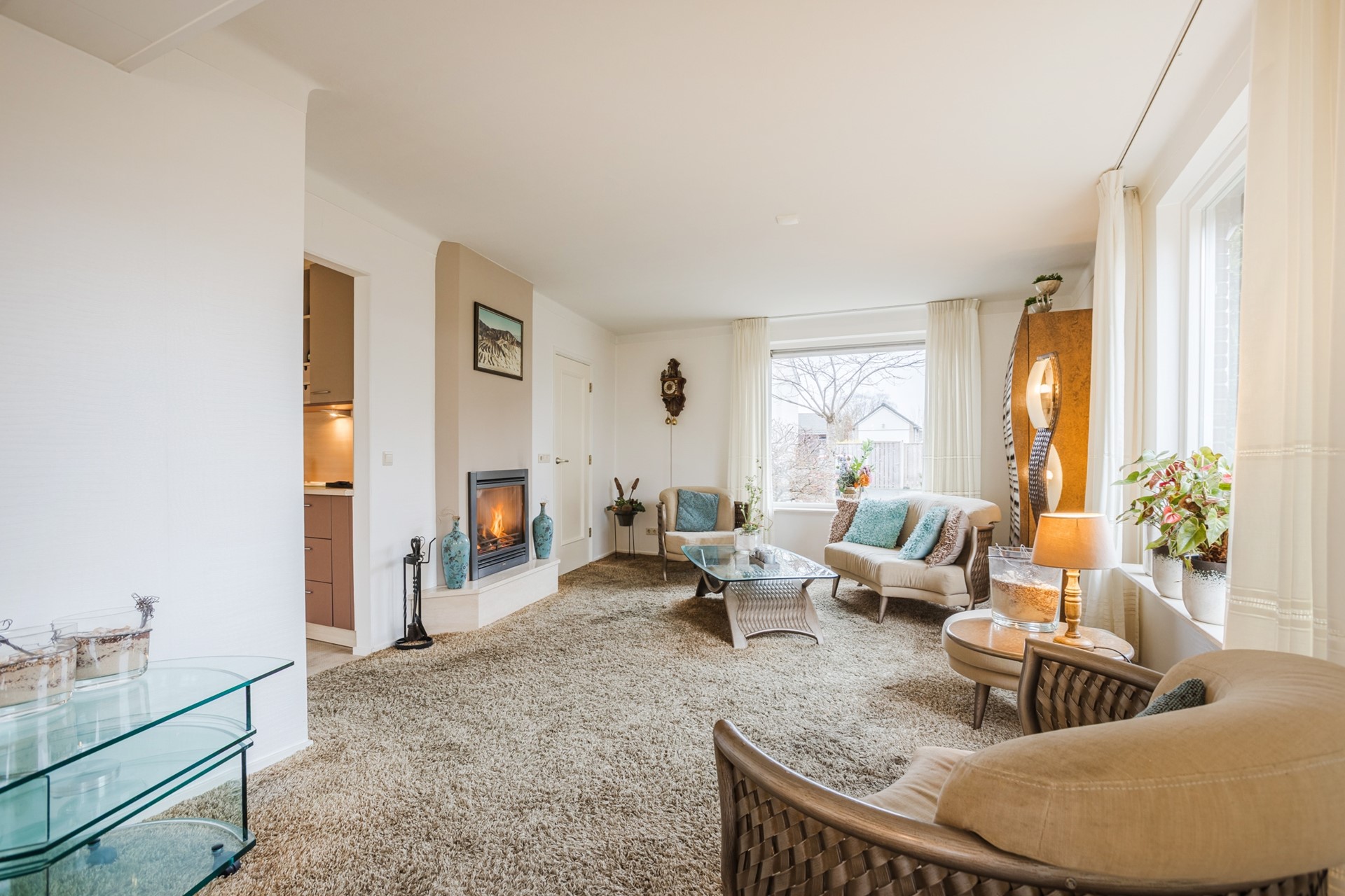 Wat direct opvalt is de royale en lichte woonkamer met sfeervolle gashaard en tuindeuren naar het terras. Een fijne plek waar binnen en buiten mooi in elkaar overlopen. De woning beschikt daarnaast over maar liefst vier slaapkamers en twee badkamers, wat zorgt voor comfort en flexibiliteit. De aanwezigheid van een slaap- en badkamer op de begane grond maakt de woning bovendien toekomstbestendig.