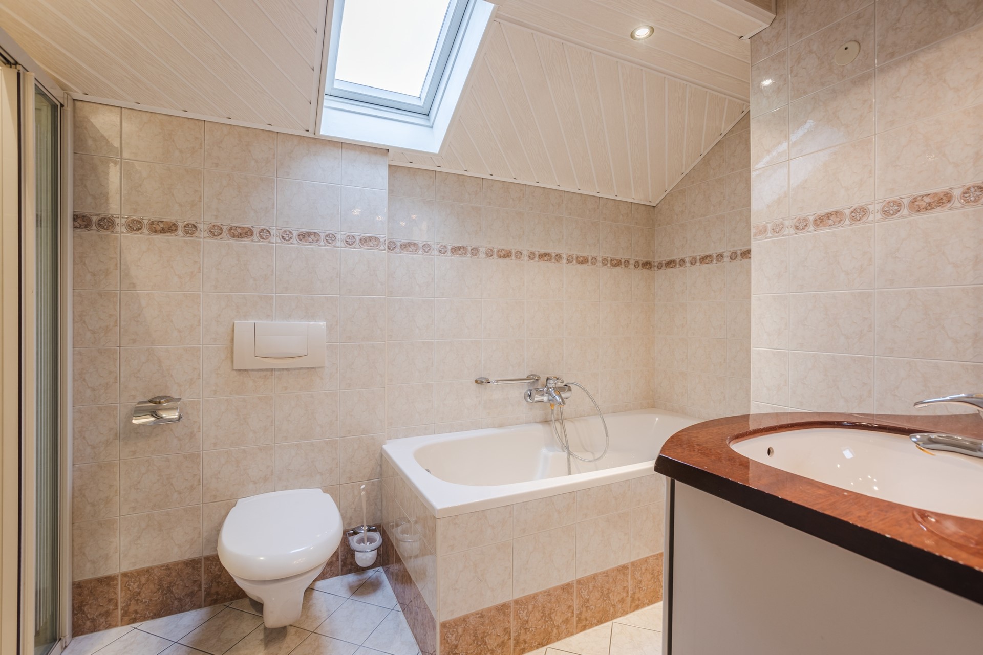 Overloop, portaal/tussenkamer met deurtje naar zolderruimte/bergruimte,woonkamer/slaapkamer met deur naar balkon, badkamer met 2e wandcloset, ligbad, douche-inrichting en wastafelmeubel, slaapkamer met vaste kast en wastafelmeubel, slaapkamer met vaste kast.
