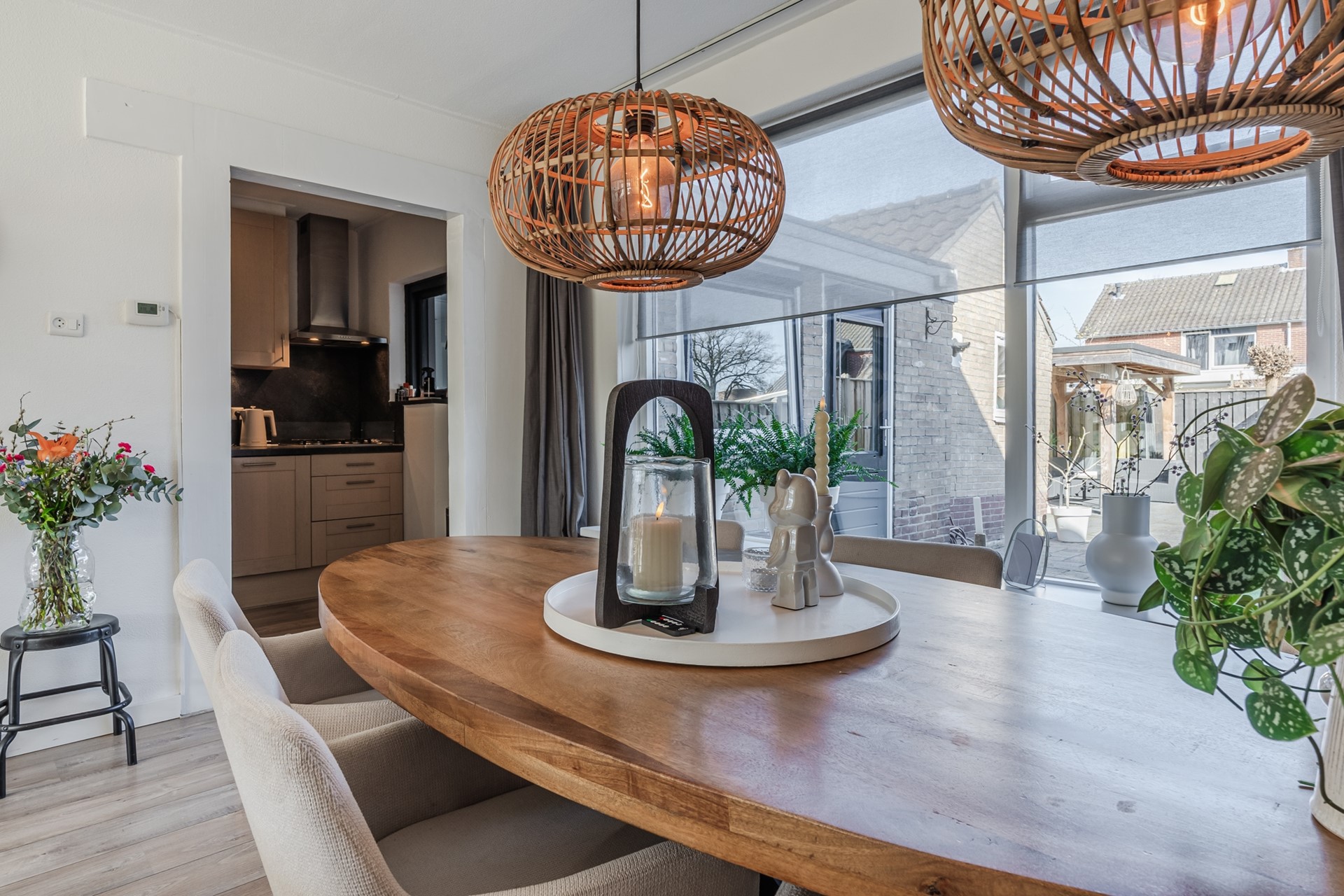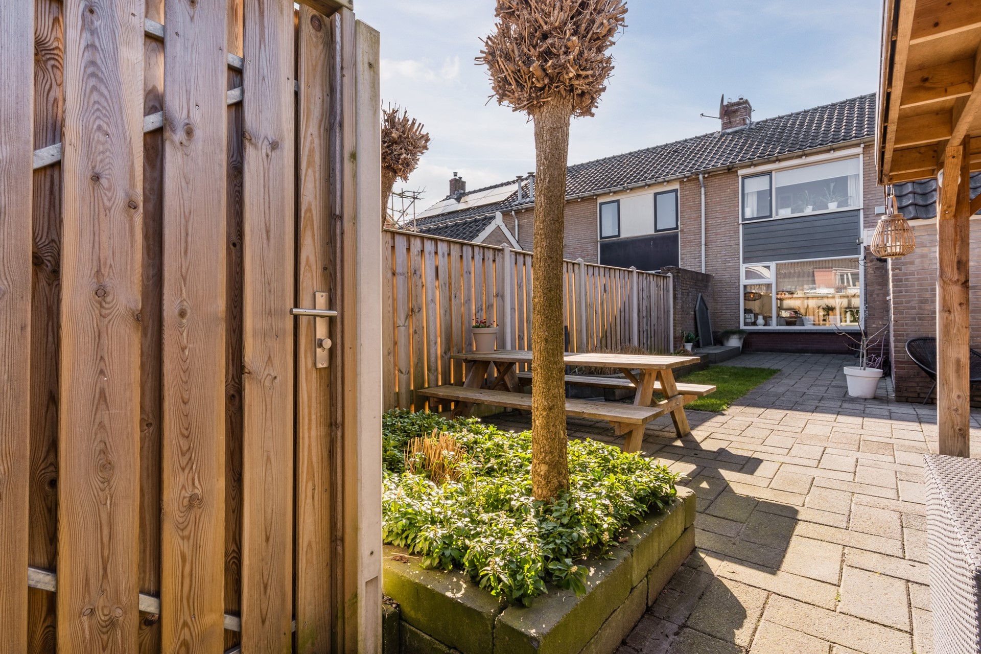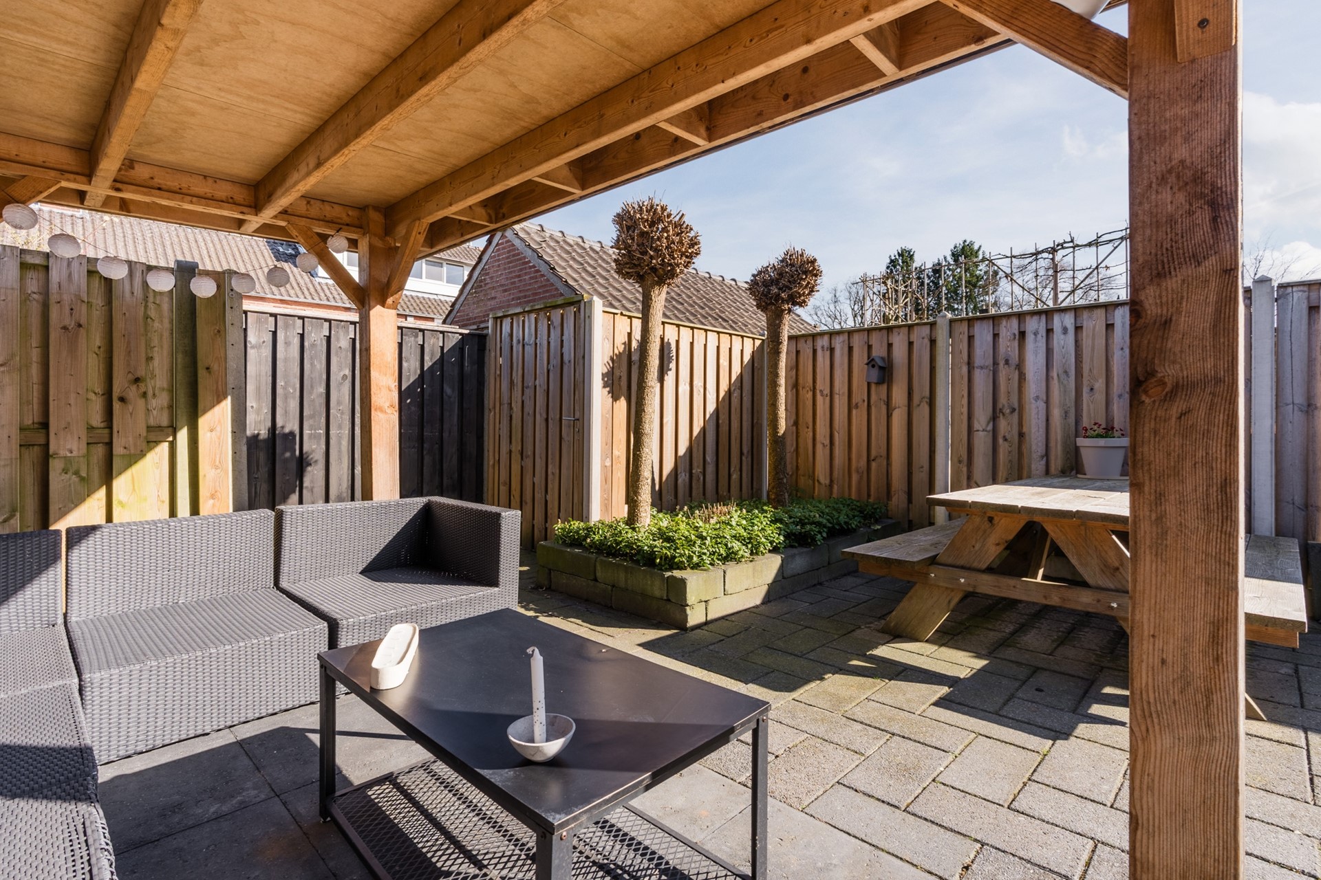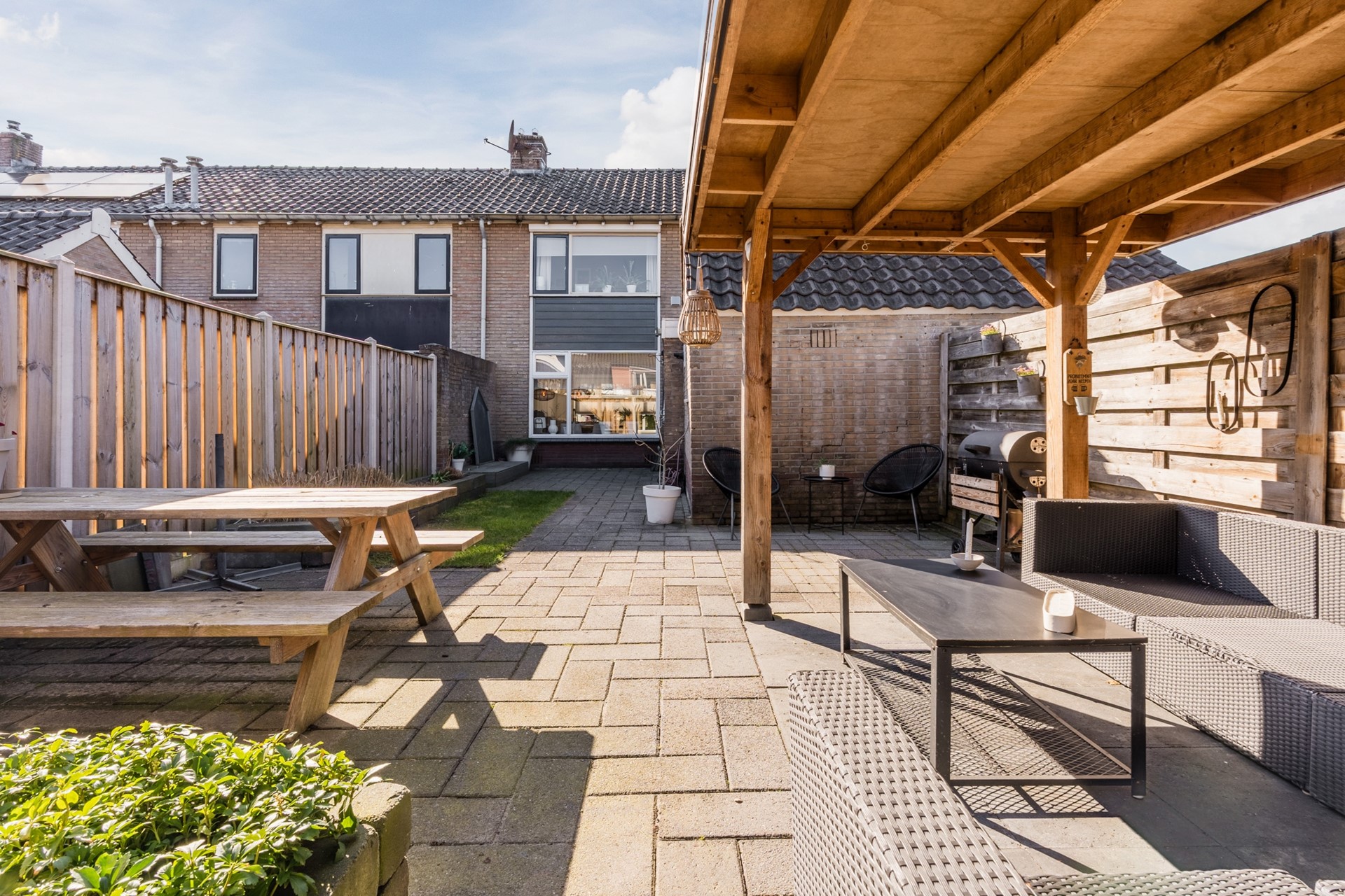De achtertuin is gelegen op het zuidoosten en beschikt over een overkapping (2022), perfect om het hele jaar door van het buitenleven te genieten. De aangebouwde bijkeuken en berging bieden extra praktische ruimte.