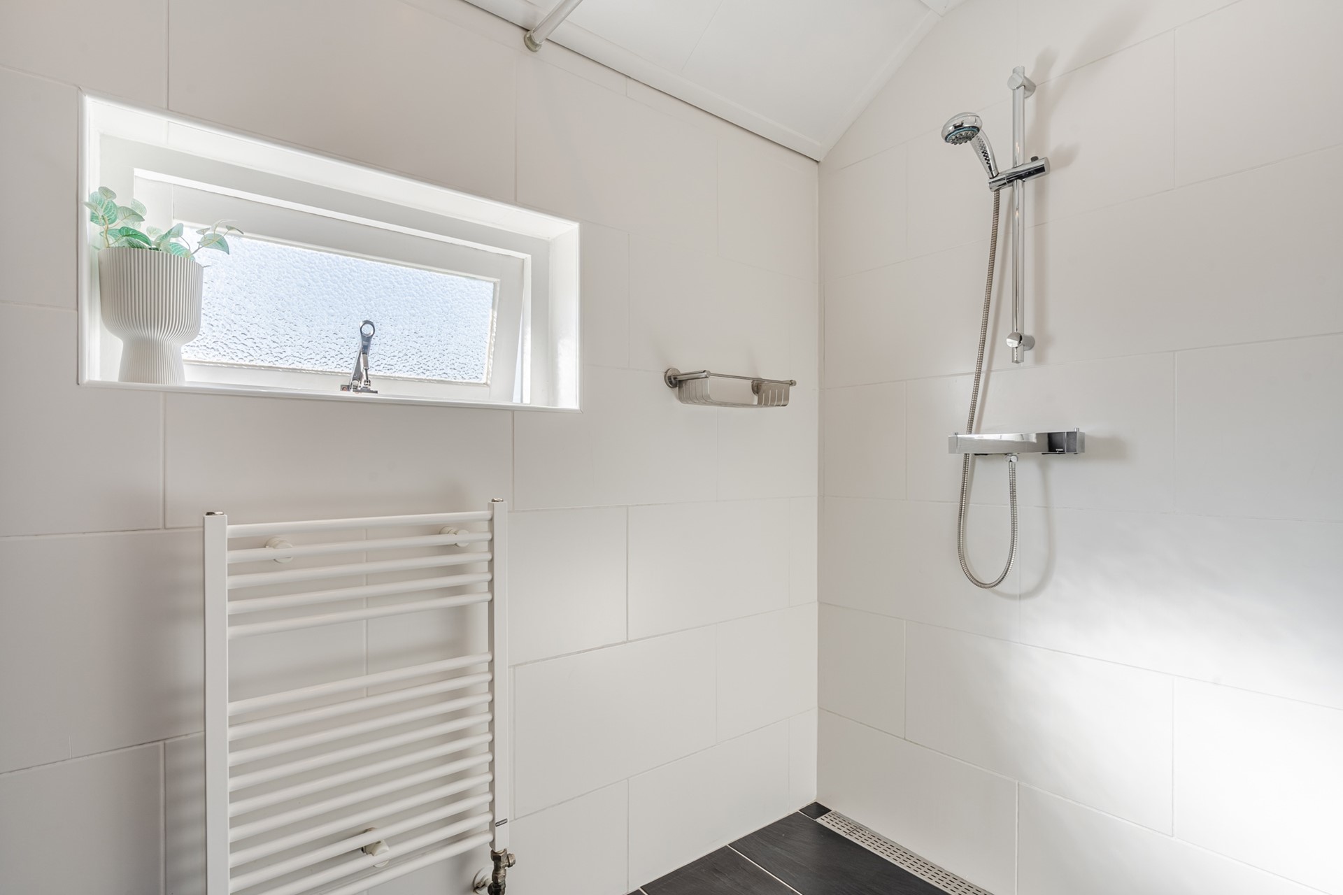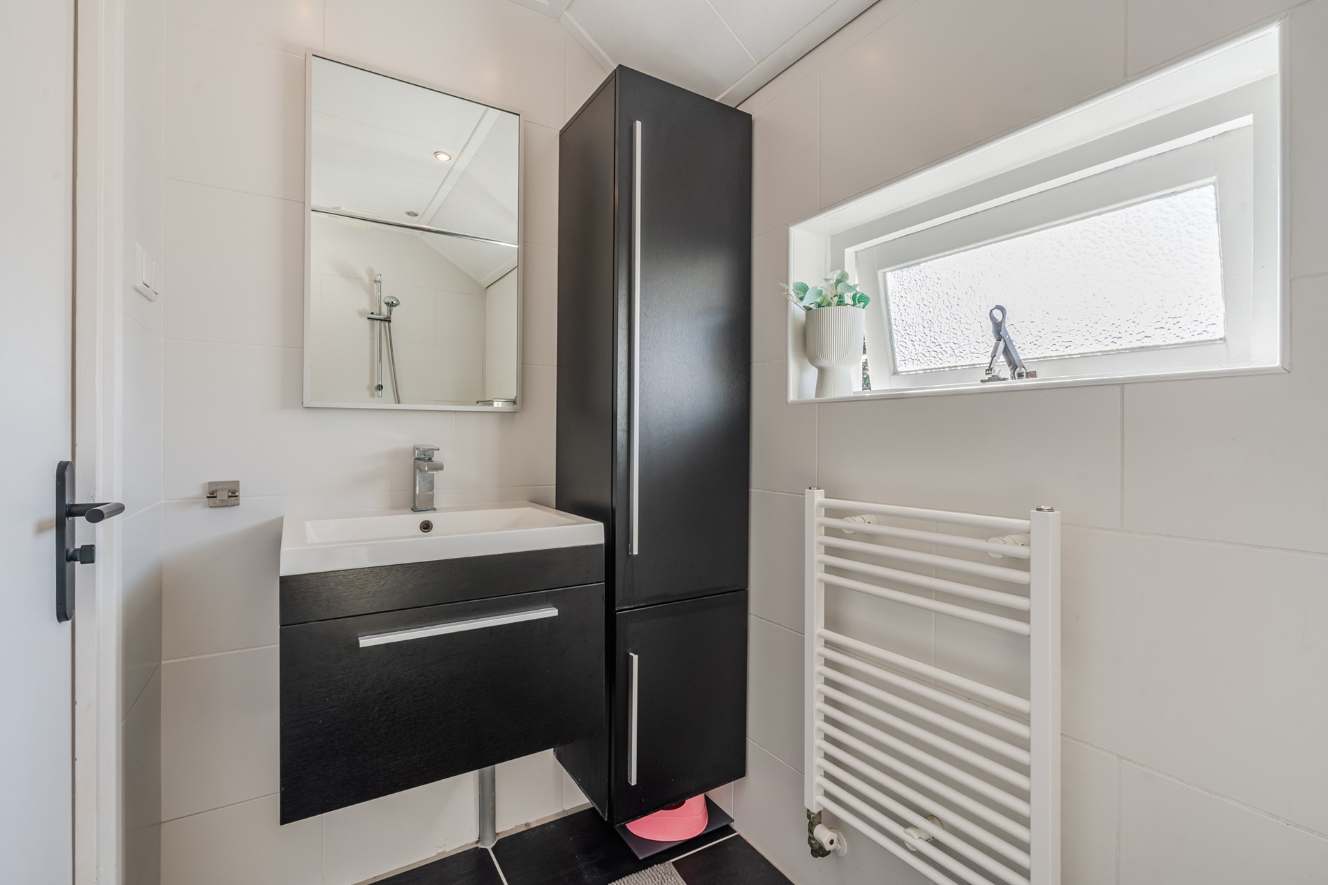 Overloop, 3 slaapkamers waarvan 1 met een vaste kast, moderne lichte badkamer (2010) met douche-inrichting, wastafelmeubel en extra wandkast en designradiator.