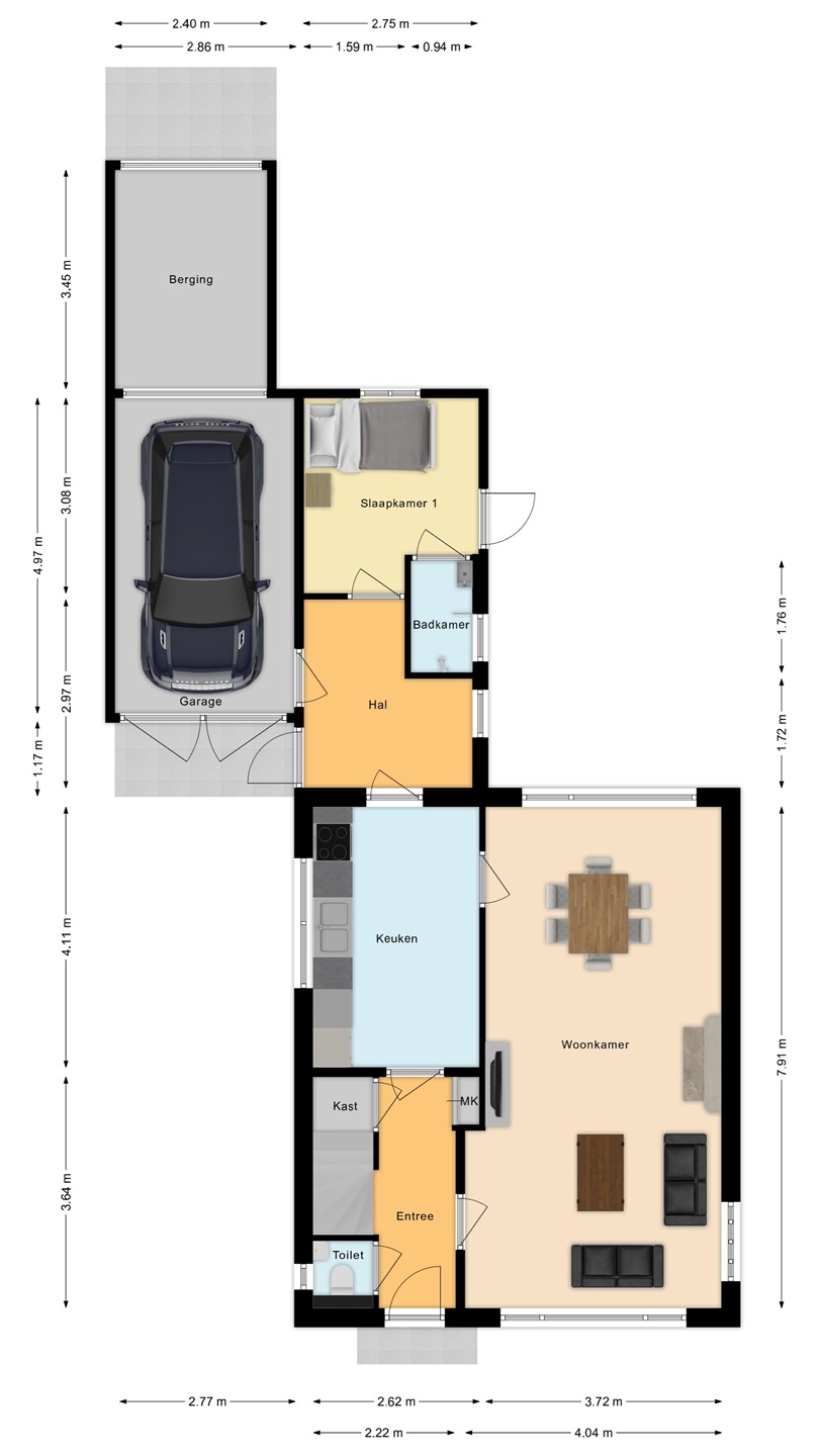 Bijgebouwen: - Aangebouwde garage met een inwendige afmeting van ca. 5.17 x 2.87 meter. - Achtergelegen schuurruimte met een inwendige afmeting van ca. 3.58 x 3.39 meter.