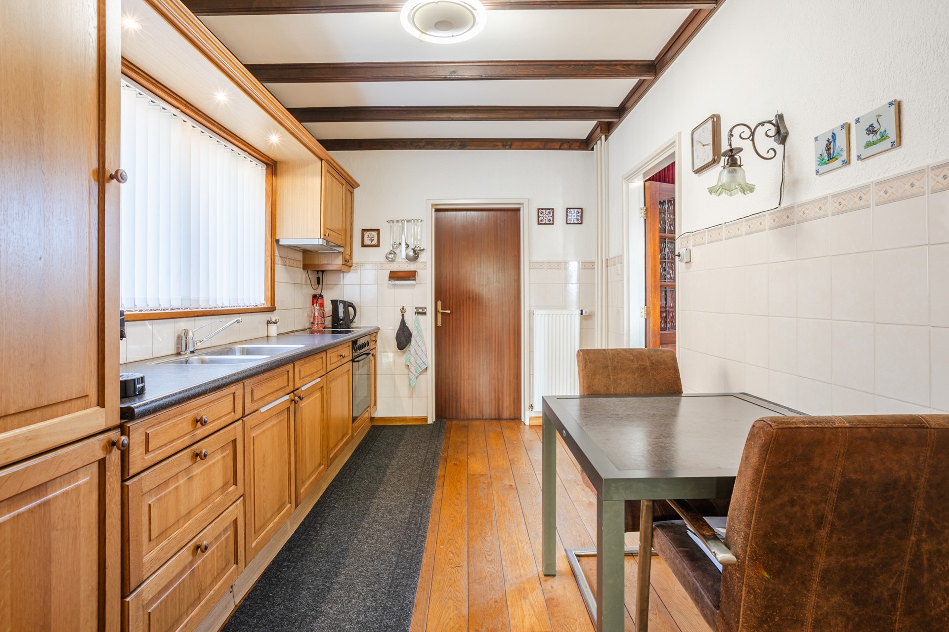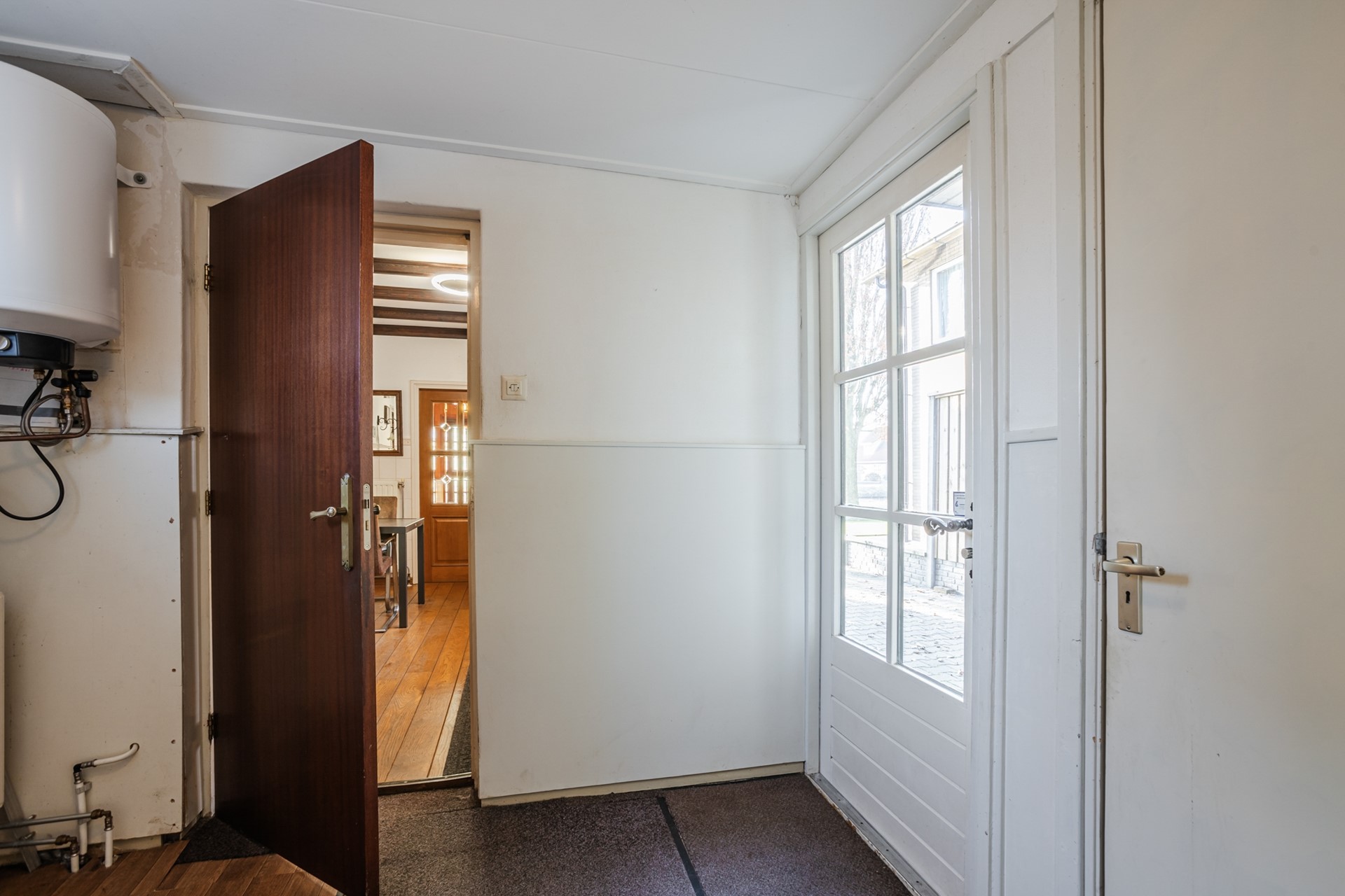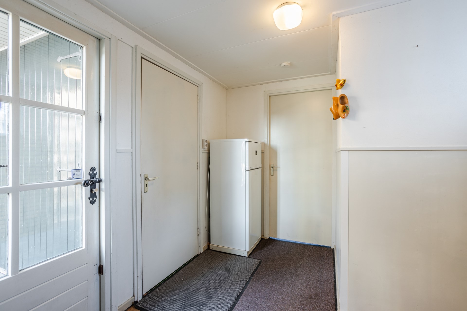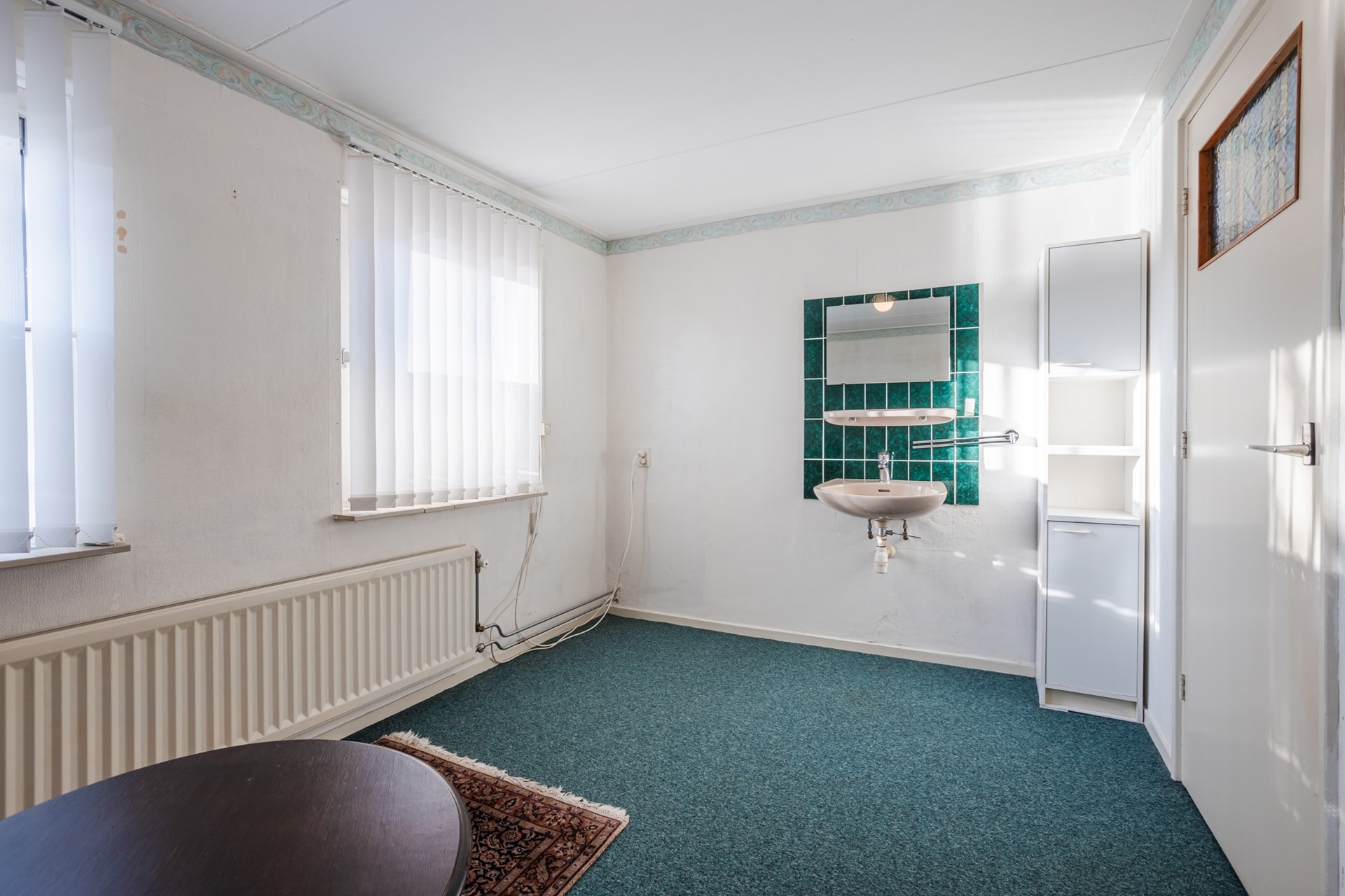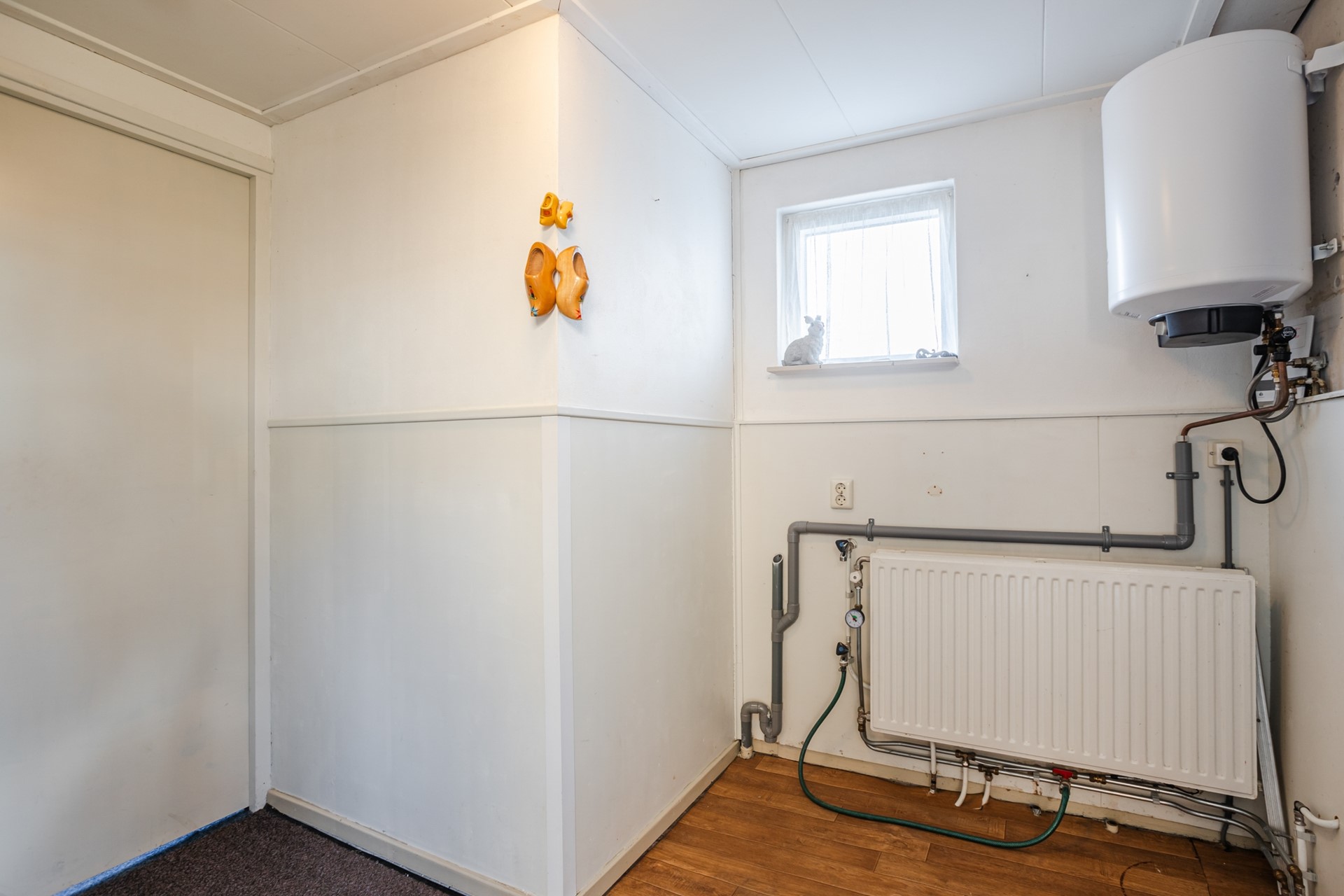 Entree/hal, wandcloset met fontein, trapopgang met kelderkast, meterkast, rechthoekige woonkamer met parketvloer en gashaard, dichte keuken met parketvloer en standaard keukenblok voorzien van enige inbouwapparatuur, bijkeuken/achteringang met opstelplaats boiler, kantoor/slaapkamertje met aangrenzende badkamer (2016) met wastafel, designradiator en douche-inrichting, doorgang vanuit de bijkeuken naar de garage met daarachter nog een extra schuurruimte.