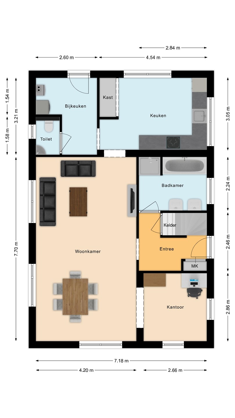 Deze ruime woning biedt veel wooncomfort en praktische mogelijkheden. Op de begane grond bevindt zich een lichte L-vormige woonkamer, waarbij het zijgedeelte eenvoudig is om te vormen tot een slaapkamer. Hierdoor is gelijkvloers wonen mogelijk. Verder beschikt de woning over een complete badkamer, een ruime keuken met inbouwapparatuur, een provisiekelder en een bijkeuken.