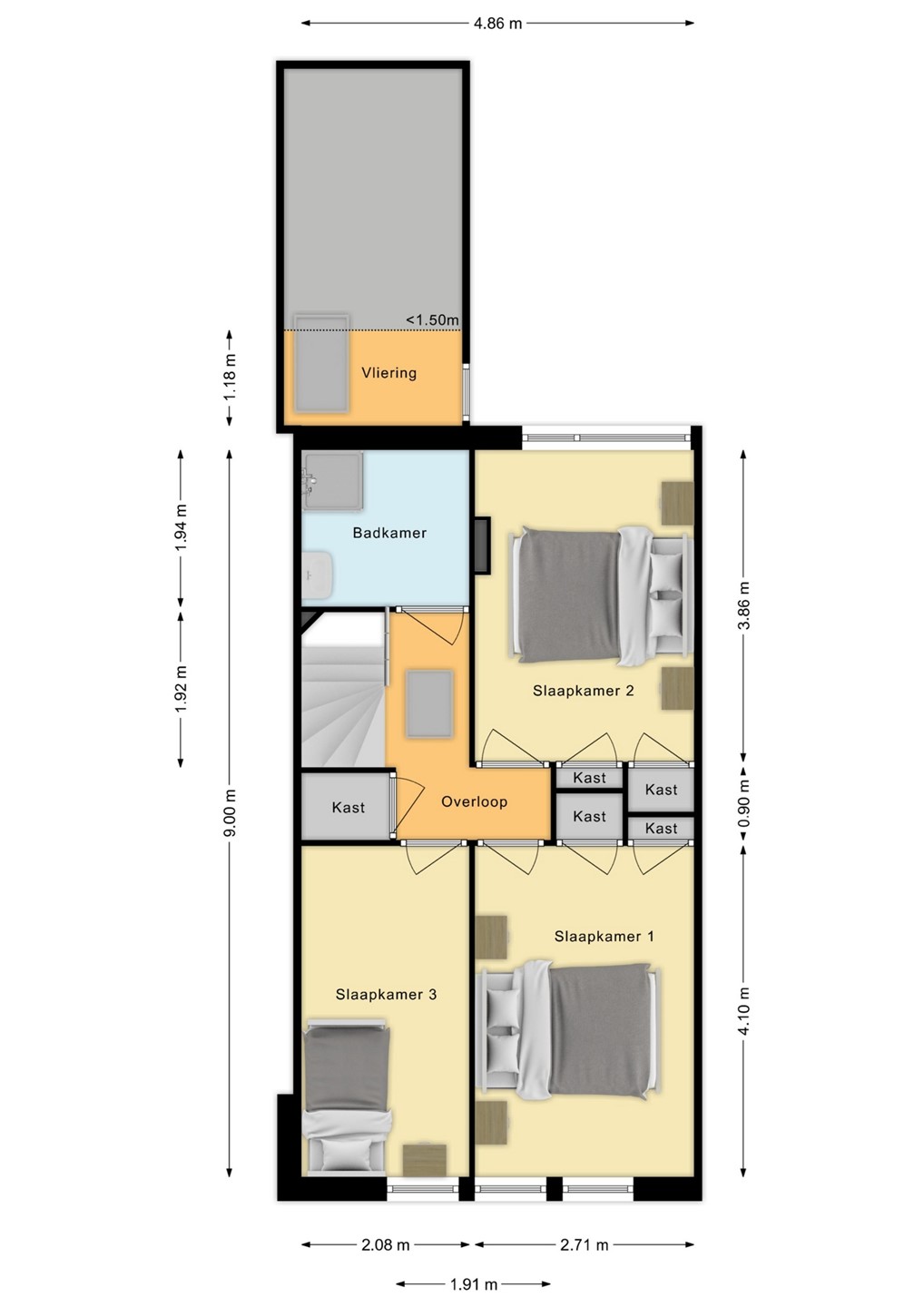 Overloop met vaste trap naar 2e verdieping en vaste kast, badkamer met wastafel, 2e staand toilet en douche-inrichting, 3 slaapkamers waarvan 2 met vaste kasten.